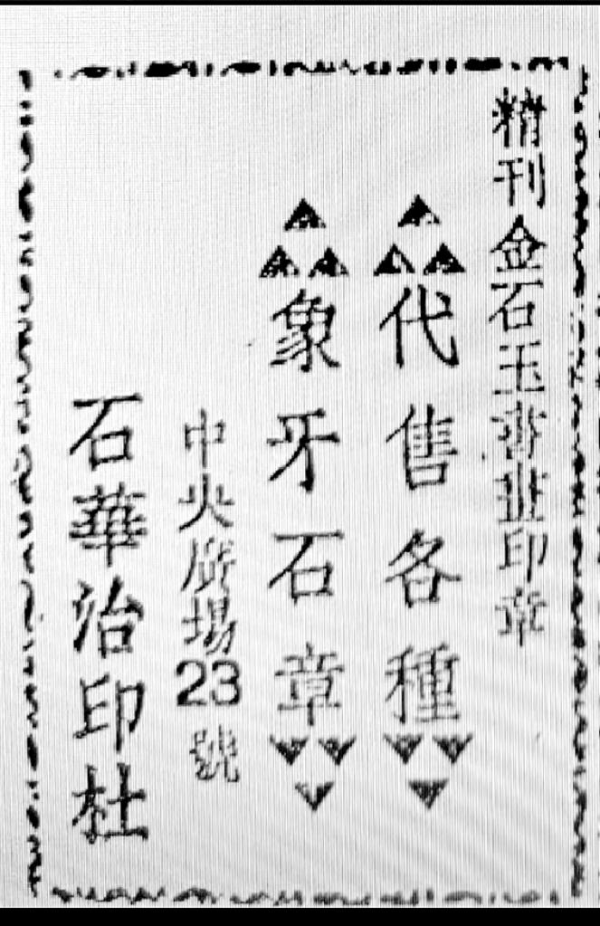 最后要提到的一則廣告也與文化有關(guān)。蘭州和平日?qǐng)?bào)社1947年出版的《新蘭州》一書中,曾刊登石華治印社廣告,其廣告詞曰:“精刊金石玉書畫印章、代售各種象牙石章”,社址在中央廣場23號(hào),其創(chuàng)辦者即為隴右印壇名宿駱石華先生。駱石華先生1920年生人,彼時(shí)未及而立,尚未入白石先生門下;筆者家外祖解放前供職中央廣場郵局,當(dāng)年曾與石華先生相交。今偶于舊籍中覓得石華治印社當(dāng)年廣告,恭錄于此,既為本文收尾,亦為家外祖與石華先生半個(gè)世紀(jì)友誼之緬懷。