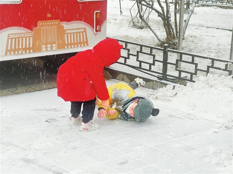 小朋友在雪地里嬉戲。 新甘肅照片