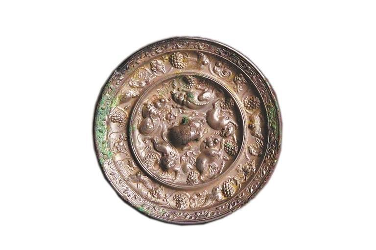 我省天水市博物館的眾多藏品中,有一面海獸葡萄紋銅鏡,大致出現(xiàn)于武則天執(zhí)政時期(684年—705年)。銅鏡上五只瑞獸作匍匐狀,攀援著葡萄枝蔓,這里的海獸就是來自西域的獅子,古人稱為“狻猊”。此外鏡上葡萄藤葉鋪陳、點綴著禽鳥和卷草,精美絕倫,彰顯著大唐開放包容的盛世氣象。