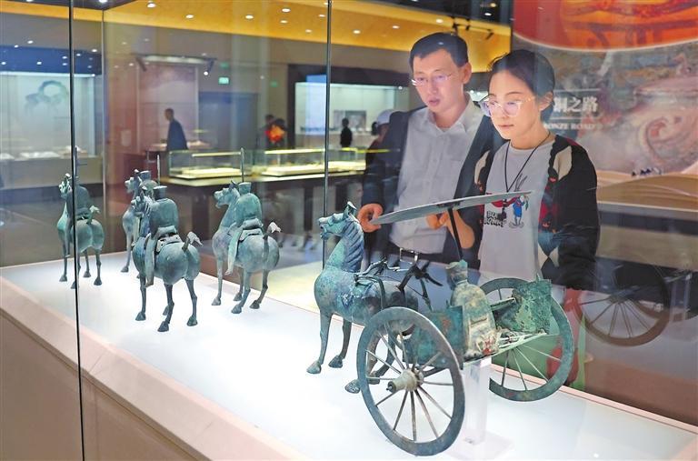 參觀者駐足欣賞絲綢之路文明展上的精美展品。