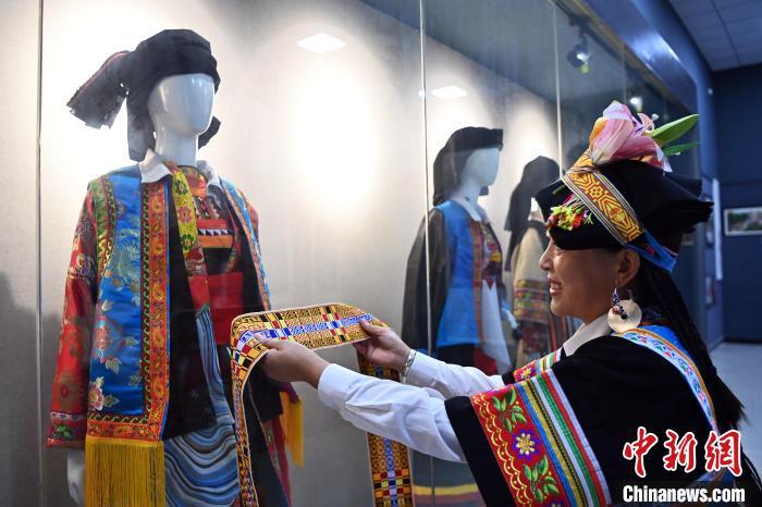 9月26日,甘肅省甘南藏族自治州舟曲縣,當(dāng)?shù)夭刈鍕D女展示錦帶佩戴方式。錦帶是舟曲藏族婦女用以束腰、扎靴、攏發(fā)乃至點(diǎn)綴服飾的花帶子,艷麗多彩、圖案優(yōu)美。每逢吉慶節(jié)日,藏族婦女穿戴的華麗盛裝就需要少則五、六條,多則十幾條寬窄長(zhǎng)短相宜的錦帶來(lái)裝飾。據(jù)介紹,藏族織錦帶技藝歷史悠久,一千多年以前,古羌族和吐蕃已有了較發(fā)達(dá)的手工編織技術(shù),在艱難的生活條件下對(duì)服飾等生活用品除實(shí)用功能之外,已經(jīng)有了強(qiáng)烈的審美追求,是研究舟曲羌藏文化的“活化石”。中新社記者 九美旦增 攝