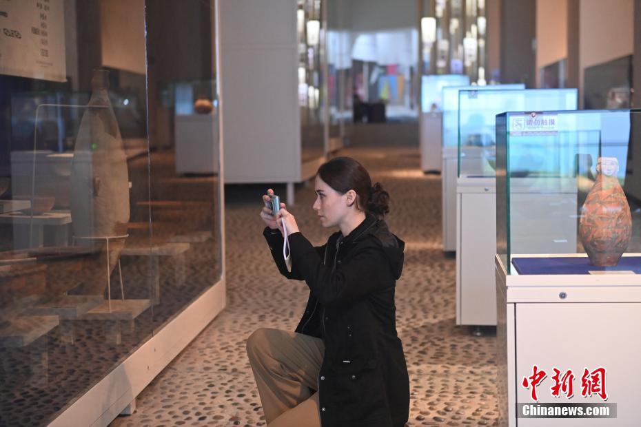 ?。保霸拢玻踩?,2024青年漢學(xué)家研修計(jì)劃甘肅班團(tuán)隊(duì)22個(gè)國家的青年漢學(xué)家,走進(jìn)甘肅省天水市秦安縣大地灣遺址參觀并進(jìn)行專題研修。大地灣遺址是新石器時(shí)代大型聚落遺址,出土了中國乃至世界上最早的彩陶文化、最早的文字符號(hào)、種植生產(chǎn)了中國第一批糧食品種黍、出現(xiàn)了最早的宮殿式建筑、發(fā)明了世界最早的水泥地面、創(chuàng)造了最早的繪畫作品——F411地畫。圖為國外青年漢學(xué)家拍攝大地灣博物館藏品。中新社記者 李亞龍 攝