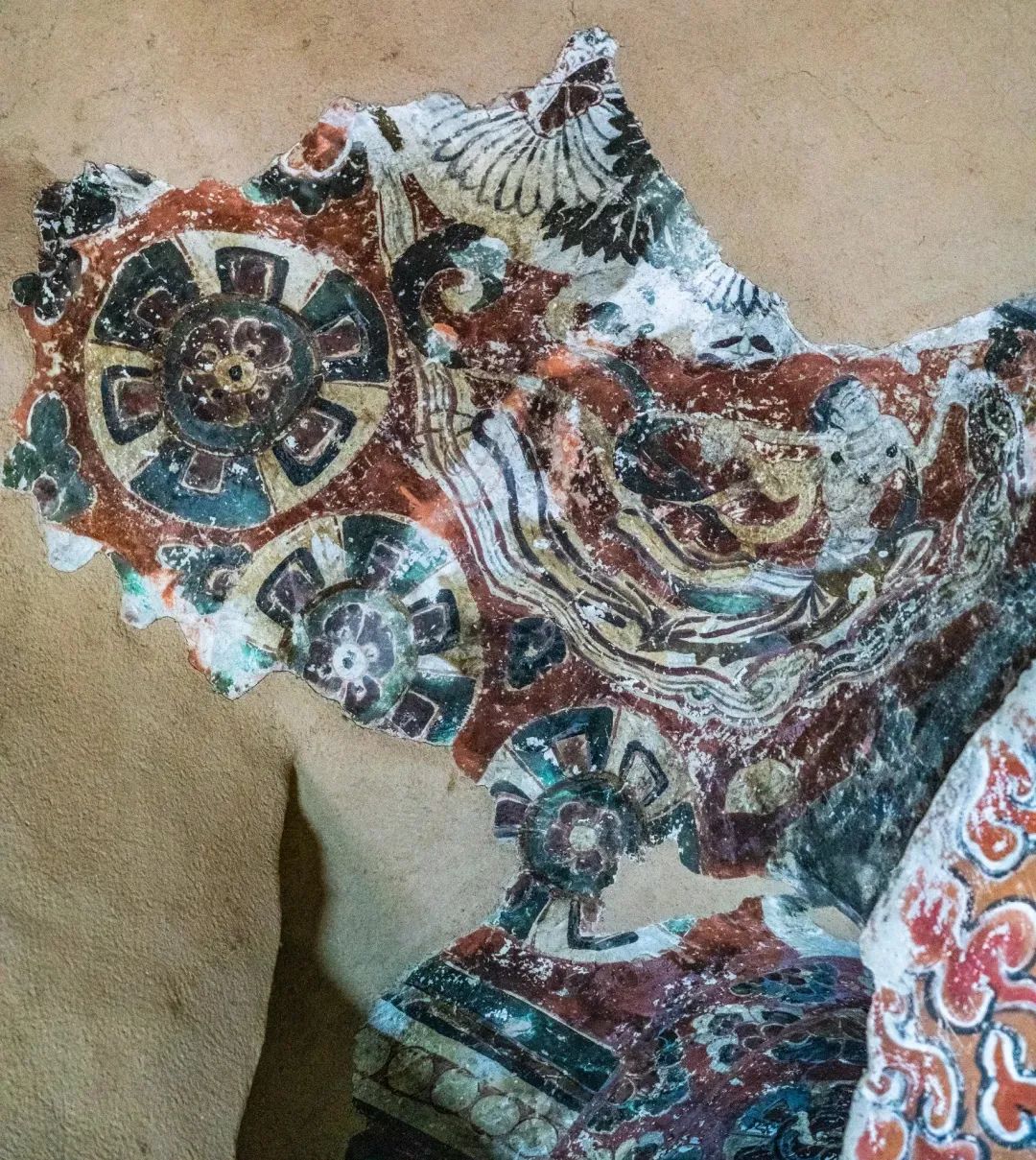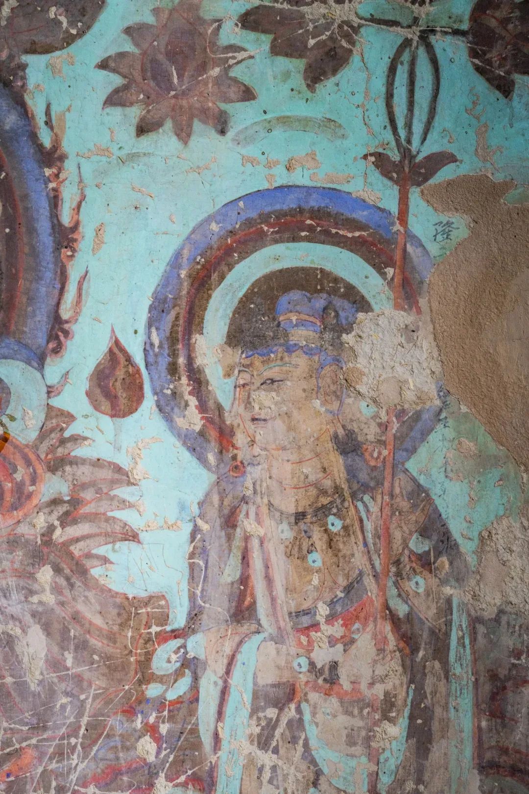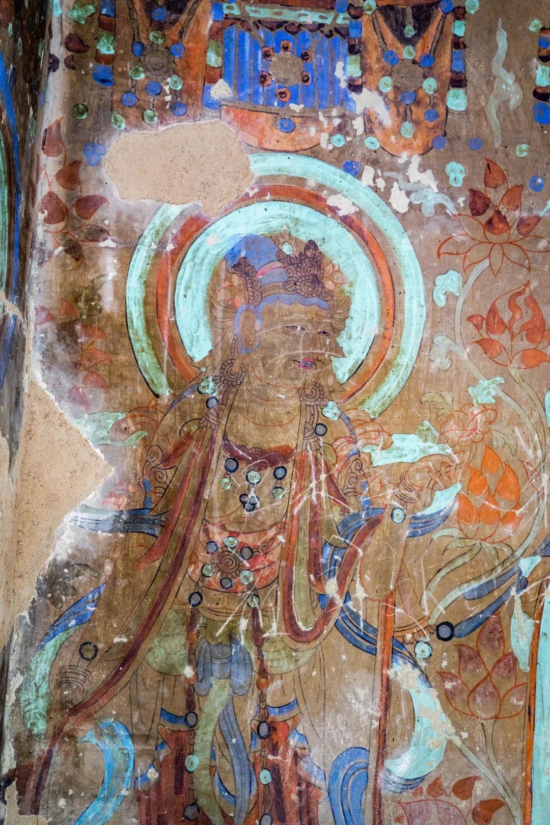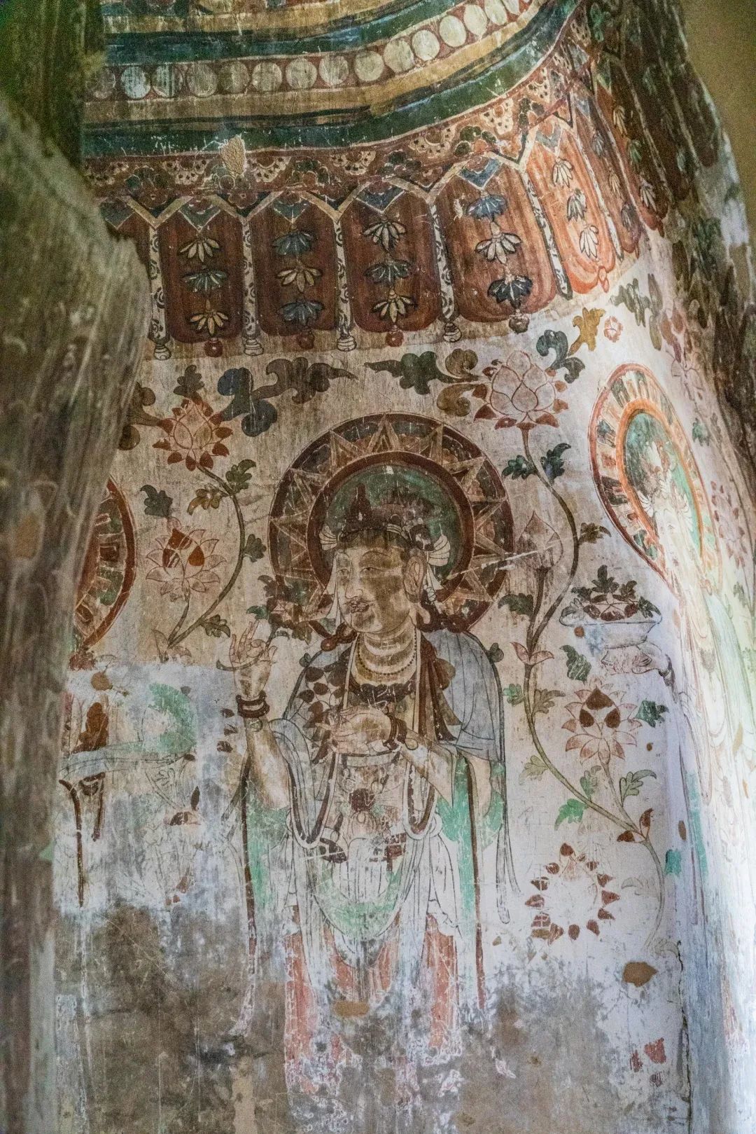 昌馬石窟第4窟洞窟形制及其殘存的塑像對(duì)于研究中國(guó)早期石窟藝術(shù)與佛教造像藝術(shù)極其重要。窟內(nèi)壁畫(huà)內(nèi)容是四壁上方畫(huà)條式旌幡,下畫(huà)供養(yǎng)菩薩,身高近2米,今殘存20身,菩薩周?chē)?huà)纏枝蓮,與第二窟基本相同。窟頂前半部地仗大部分脫落,靠近中心柱正面上部右側(cè)的部位殘存龜形六瓣團(tuán)花圖案與一身飛天及菊花紋圖案。后部中心柱頂部周?chē)唔敱砻胬L龜形六瓣團(tuán)花、連珠紋等圖案。