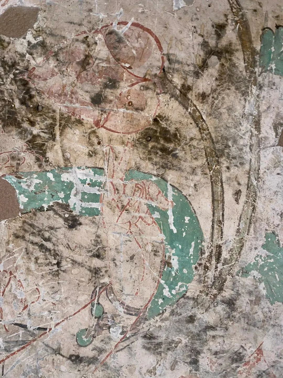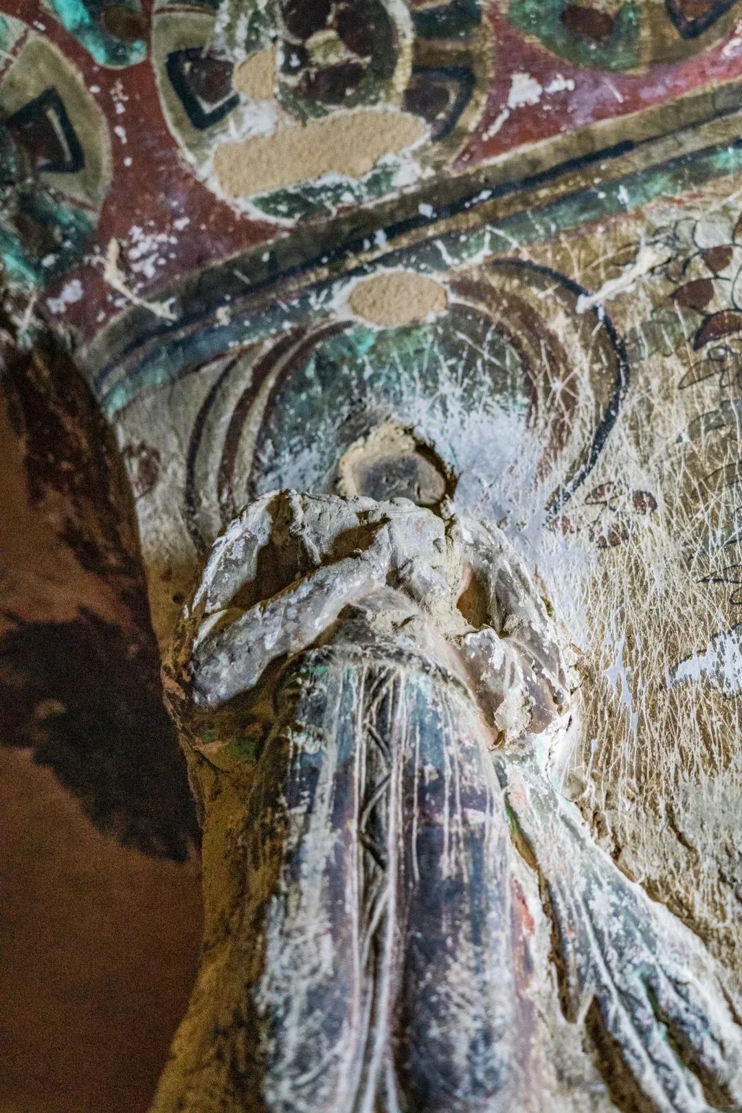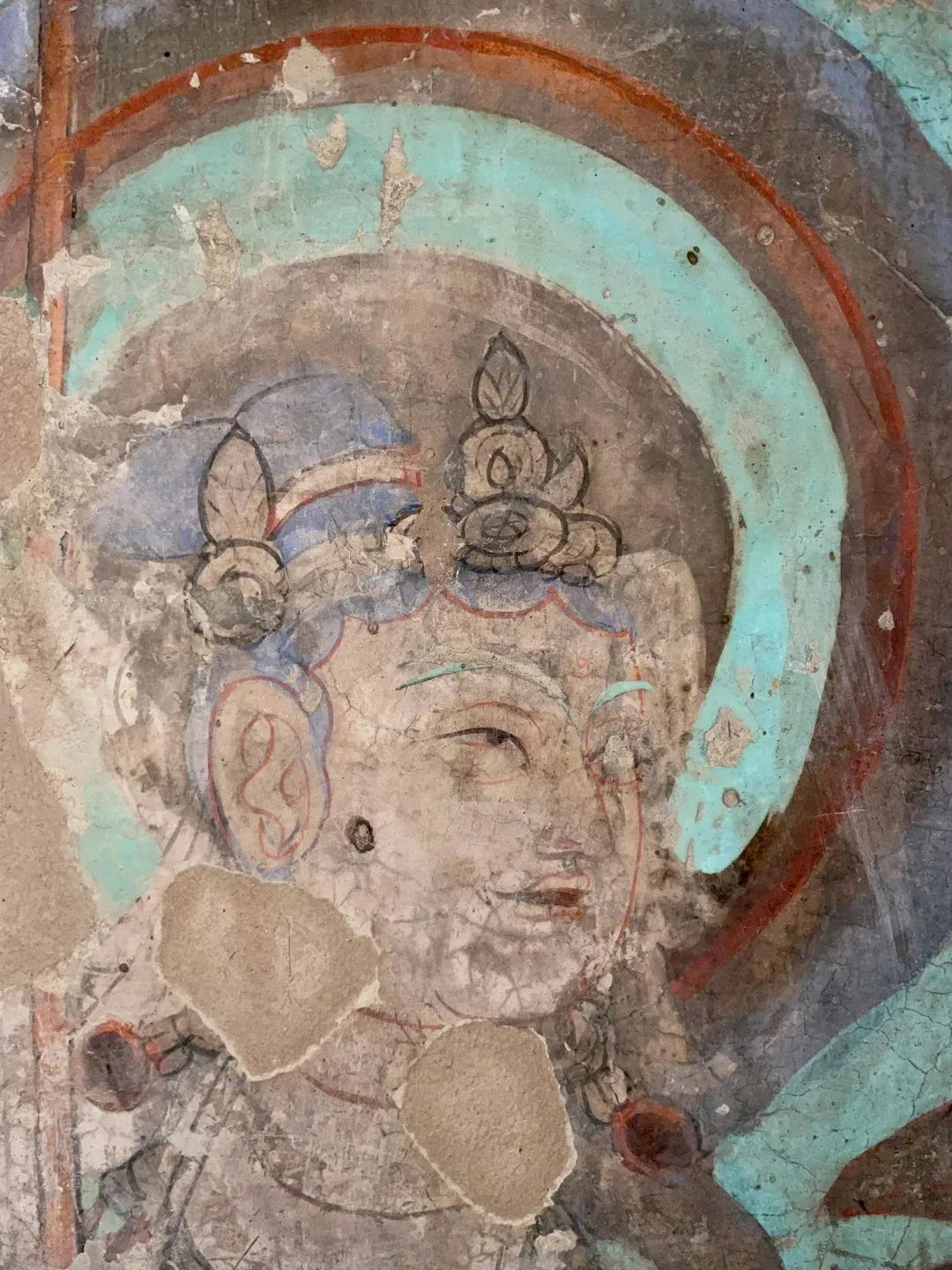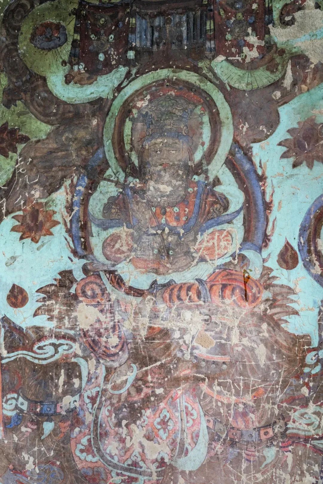 昌馬石窟第4窟洞窟形制及其殘存的塑像對(duì)于研究中國(guó)早期石窟藝術(shù)與佛教造像藝術(shù)極其重要。窟內(nèi)壁畫(huà)內(nèi)容是四壁上方畫(huà)條式旌幡,下畫(huà)供養(yǎng)菩薩,身高近2米,今殘存20身,菩薩周?chē)?huà)纏枝蓮,與第二窟基本相同。窟頂前半部地仗大部分脫落,靠近中心柱正面上部右側(cè)的部位殘存龜形六瓣團(tuán)花圖案與一身飛天及菊花紋圖案。后部中心柱頂部周?chē)唔敱砻胬L龜形六瓣團(tuán)花、連珠紋等圖案。