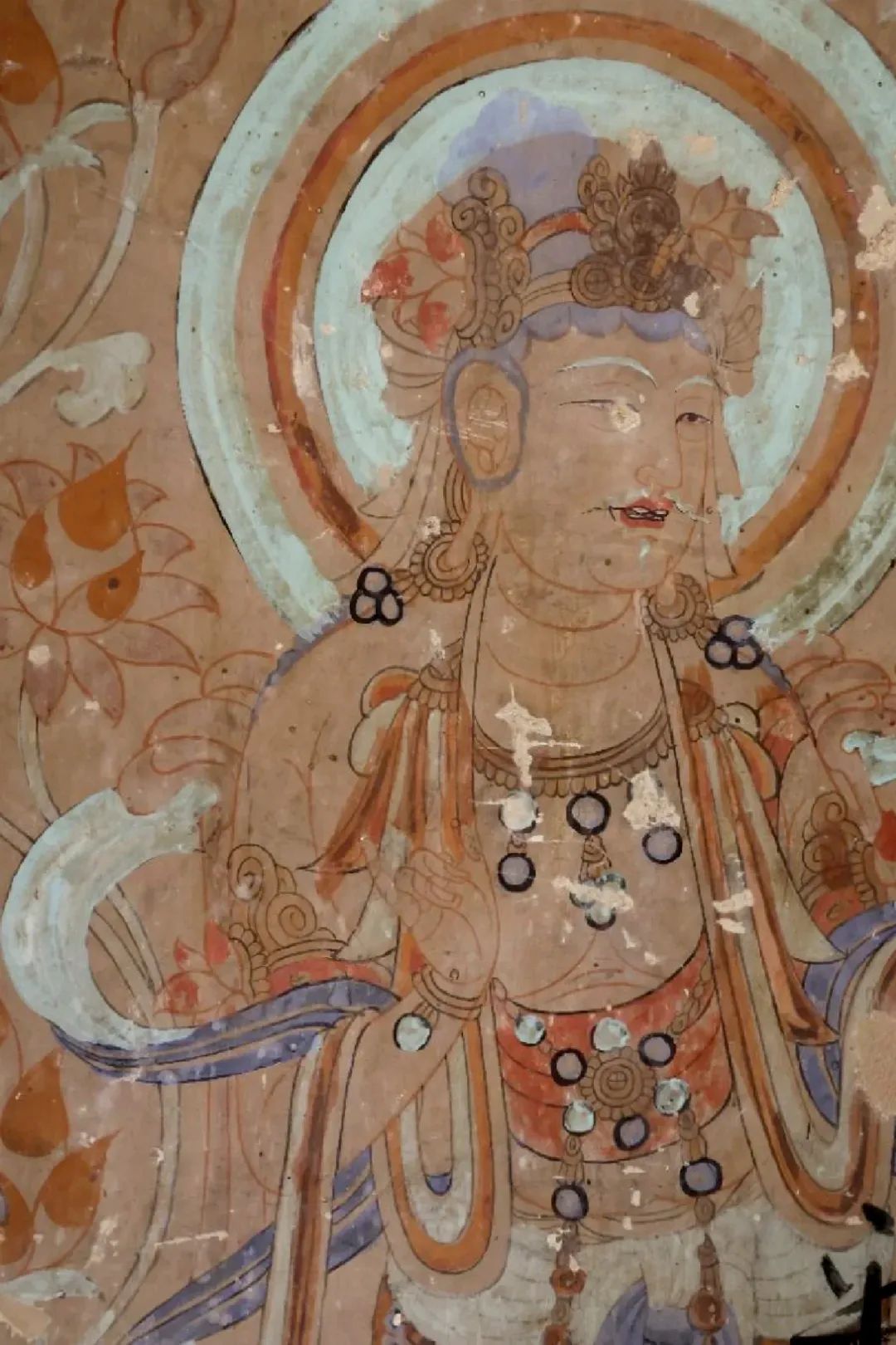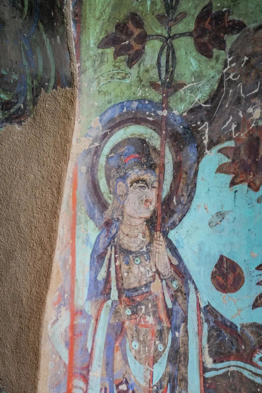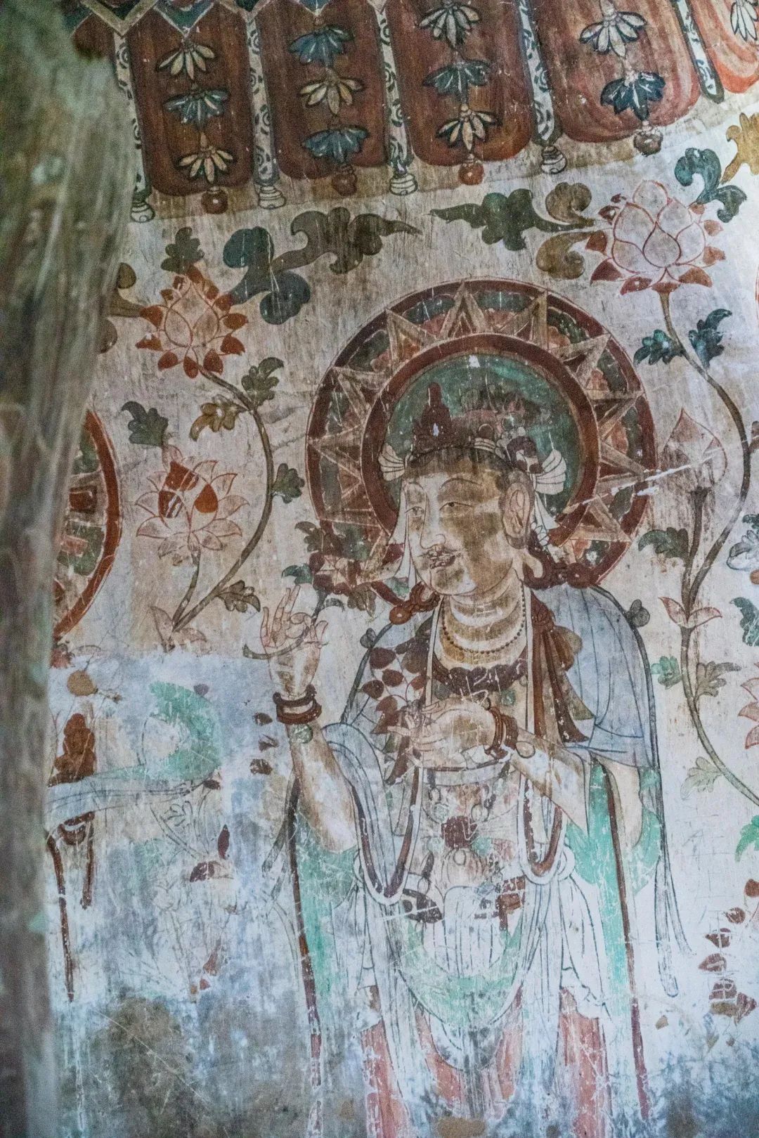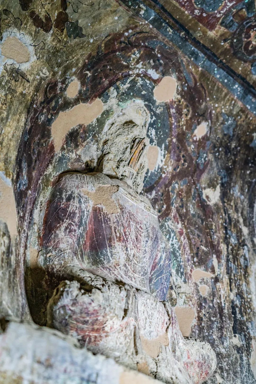 昌馬石窟第4窟洞窟形制及其殘存的塑像對(duì)于研究中國(guó)早期石窟藝術(shù)與佛教造像藝術(shù)極其重要。窟內(nèi)壁畫(huà)內(nèi)容是四壁上方畫(huà)條式旌幡,下畫(huà)供養(yǎng)菩薩,身高近2米,今殘存20身,菩薩周?chē)?huà)纏枝蓮,與第二窟基本相同。窟頂前半部地仗大部分脫落,靠近中心柱正面上部右側(cè)的部位殘存龜形六瓣團(tuán)花圖案與一身飛天及菊花紋圖案。后部中心柱頂部周?chē)唔敱砻胬L龜形六瓣團(tuán)花、連珠紋等圖案。