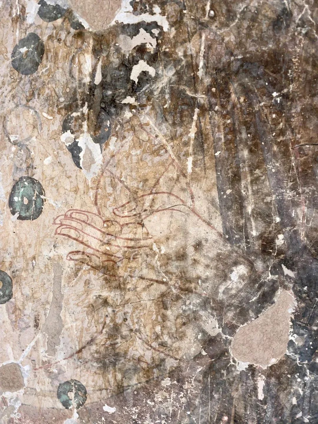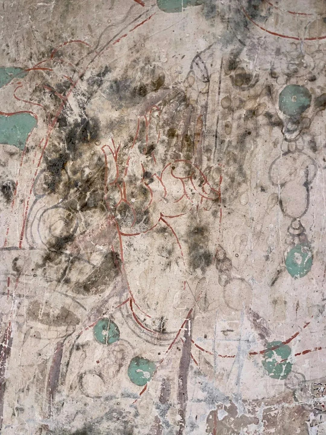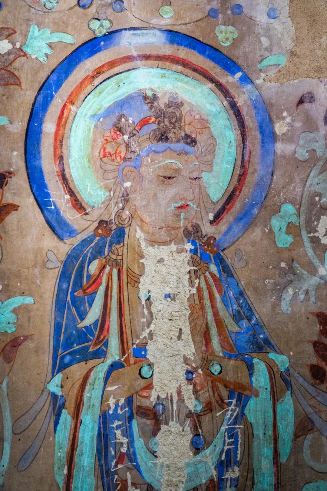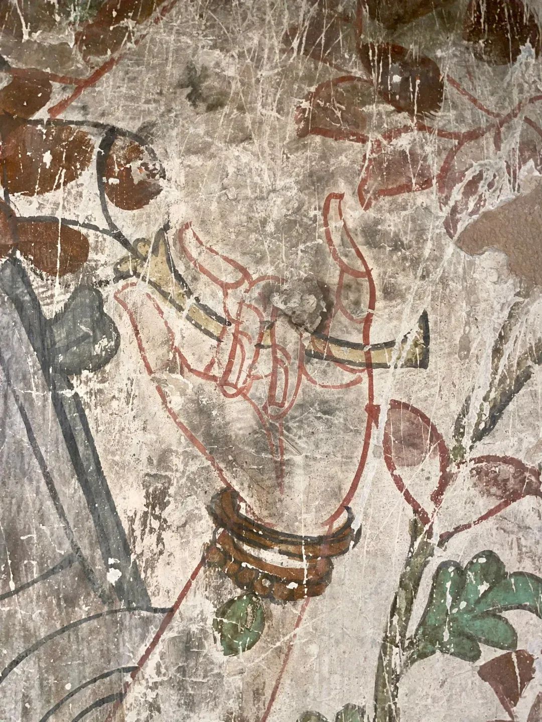 昌馬石窟第4窟洞窟形制及其殘存的塑像對(duì)于研究中國(guó)早期石窟藝術(shù)與佛教造像藝術(shù)極其重要。窟內(nèi)壁畫(huà)內(nèi)容是四壁上方畫(huà)條式旌幡,下畫(huà)供養(yǎng)菩薩,身高近2米,今殘存20身,菩薩周?chē)?huà)纏枝蓮,與第二窟基本相同。窟頂前半部地仗大部分脫落,靠近中心柱正面上部右側(cè)的部位殘存龜形六瓣團(tuán)花圖案與一身飛天及菊花紋圖案。后部中心柱頂部周?chē)唔敱砻胬L龜形六瓣團(tuán)花、連珠紋等圖案。