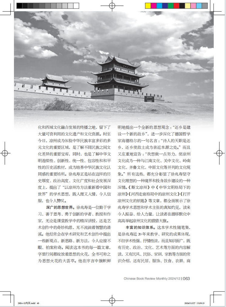 深廣的思想世界。徐兆壽是一位勤于學習、善于思考、勇于創(chuàng)新的學者、教授和作家,無論是課堂教學中的精深講授,還是藝術(shù)創(chuàng)作中的奇妙構(gòu)思,無不流淌著智慧的清溪。他經(jīng)常會在學術(shù)研究和藝術(shù)創(chuàng)作中提出一些新觀點、新思路、新方法,令人應接不暇、拍案稱奇。閱讀這本書的每一篇文章,字里行間都綻放著思想的火花,全書可稱之為思想火花的大薈萃。他在序言中旗幟鮮明地提出一個全新的思想觀念 :“還鄉(xiāng)是建設一個新的故鄉(xiāng)”,進一步深化了德國哲學家海德格爾的一句名言 :“詩人的天職是還鄉(xiāng),還鄉(xiāng)使故土成為親近本源之處。”而且又莊重地宣告 :“我想做一點努力,使涼州文化成為一種與江南文化、關中文化、嶺南文化、齊魯文化、中原文化等并列的文化現(xiàn)象。”所有這些,都充分彰顯了徐兆壽堅守文化理想的一種境界和投身故鄉(xiāng)建設的一種深情?!端刮臎鲋荨分小吨腥A文明格局下的涼州》《河西走廊格局中的涼州文化》《打開涼州文化的鑰匙》等文章,都全面展示了徐兆壽學術(shù)思想和學術(shù)主張的真知灼見,讀來令人振奮、給人力量,讓讀者在潛移默化中高高舉起涼州文化的獵獵大旗。