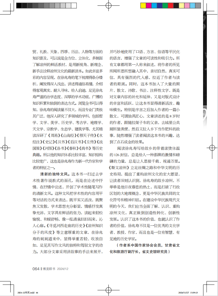 豐富的知識體系。這本學術(shù)性隨筆集,是徐兆壽近20年來教學、研究的成果體現(xiàn),不但學術(shù)性強、抒情性濃,而且知識面廣,既有歷史、政治、文化、藝術(shù)等方面的內(nèi)容解讀,又有民風、民俗、家訓、家教等方面的常識介紹,還有民居、服飾、飲食、農(nóng)耕、商貿(mào)、禮教、天象、四季、歷法、人物等方面的知識普及,可以說是全方位、立體化、多側(cè)面了解涼州的鮮活教材,是用新視角、新理念、新手法詮釋涼州文化的最新讀本。如此豐富多彩的內(nèi)容呈現(xiàn),在徐兆壽的筆下梳理得條分縷析,闡發(fā)得深入淺出,講述得通俗易懂,介紹得客觀真實,耐人尋味,給人啟迪,足見徐兆壽嚴謹?shù)闹螌W態(tài)度、深厚的學術(shù)功底、廣博的知識積累和獨到的表達方式。瀏覽全書可以得知,徐兆壽的閱讀量不僅大,而且專業(yè)門類極其廣泛,他深入研究了多領域的學科,包括哲學、文學、美學、歷史學、考古學、地理學、天文學、宗教學、生態(tài)學、建筑學等,尤其精讀深研了《周易》《山海經(jīng)》《穆天子傳》《水經(jīng)注》《史記》《漢書》《后漢書》《左傳》《戰(zhàn)國策》《河圖》《洛書》《春秋》《尚書》等歷史典籍。所以他的知識體系比較豐富,知識結(jié)構(gòu)比較寬廣,這也是徐兆壽作為新一代作家和學者的特征之一。