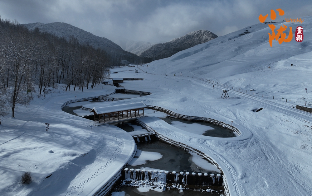 人工湖水面如鏡,與白雪相映成趣,宛如一塊無瑕的美玉鑲嵌在太子山下。