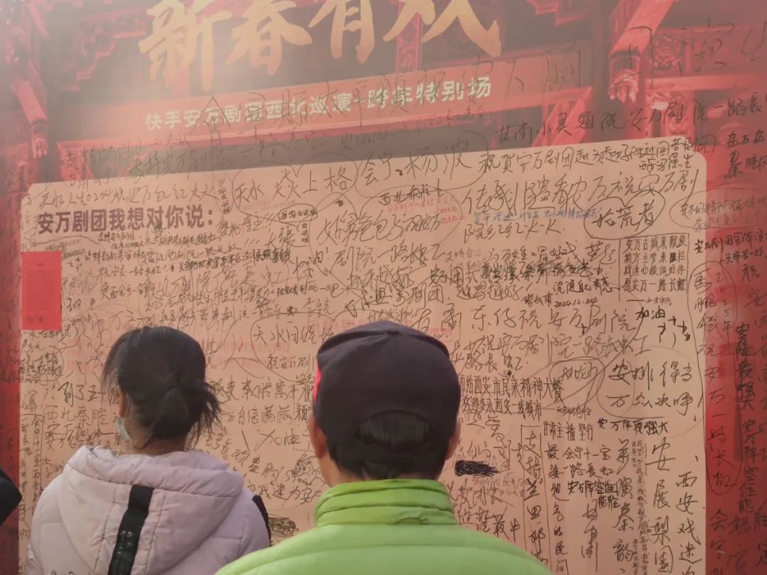 5年后,安萬帶著他的劇團來到西安,展板上寫滿了戲迷們對安萬的祝語。