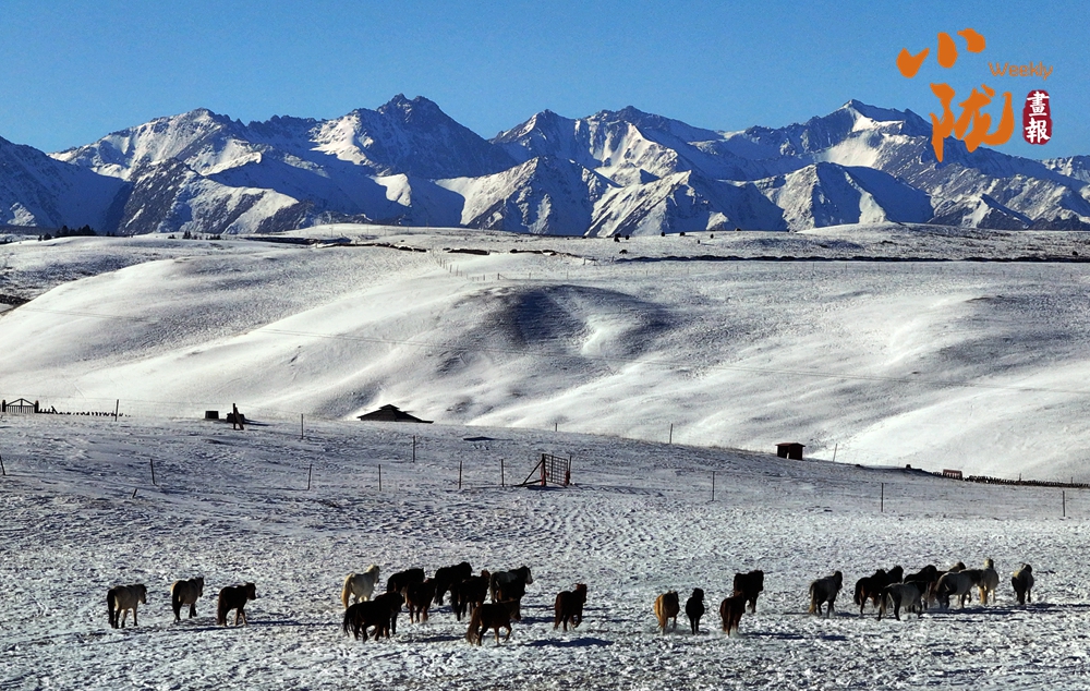 牛群在雪地中悠閑地覓食,和雪景相映成趣,給這片寧靜的草原帶來了生機與活力。