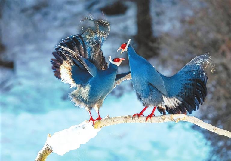 藍馬雞是珍稀名貴的禽類,頭側(cè)緋紅,耳羽簇白色、突出于頸部頂上,通體藍灰色,中央尾羽特長而翹起,尾羽披散下垂如馬尾,故名藍馬雞。冬日里,藍馬雞成群飛落山腳覓食,藍羽丹頂行走在雪地上格外搶眼。數(shù)量繁多的藍馬雞是祁連山野生山地雞的“顏值擔當”。覓食時,藍馬雞常用爪刨挖林中空地苔蘚和林緣草地,尋找掉落的云杉種子。刨食的過程會讓土壤松動,便于種子生根發(fā)芽,促進林區(qū)植物天然更新。