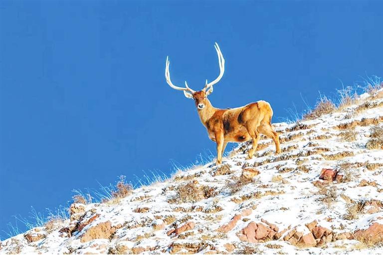 雪豹皮毛呈灰白色,有黑色點斑和黑環(huán),在巖石堆中是極好的保護色。雪豹行蹤神秘,以往人們只有通過雪地上的梅花掌印確定它的足跡。近年來,隨著祁連山生態(tài)環(huán)境的持續(xù)好轉(zhuǎn),保護區(qū)已經(jīng)成為雪豹、白唇鹿等珍稀動物繁衍生息的樂土。作為高原生態(tài)食物鏈頂端的食肉動物,雪豹對維持祁連山生態(tài)系統(tǒng)的穩(wěn)定與健康至關(guān)重要。