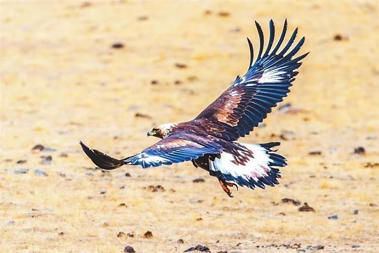 金雕以其卓越的捕獵技巧和優(yōu)雅的飛行姿態(tài)而聞名,主要棲息于高山草原、森林及河谷地帶。在祁連山遼闊的草原之上,金雕展開它那寬闊且有力的雙翅,在藍天之中肆意翱翔。陽光傾灑下來,深褐色的羽毛閃爍著如同金屬般耀眼的光澤,猶如披上了一件堅不可摧的鎧甲,威風(fēng)凜凜。它那犀利的眼神,仿佛能夠穿透重重迷霧,洞察這片廣袤土地上的每一個細微變化,盡顯王者風(fēng)范。它身姿雄偉而威嚴,宛如一位至高無上的王者,向整個世界展示著它那不容小覷的力量與威嚴,默默地守護著這片廣袤無垠的草原天地。