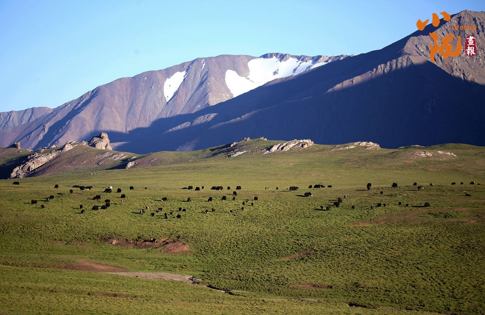 初夏時節(jié),祁連山國家公園張掖肅南縣境內,天空湛藍如洗,草原碧綠廣闊,巍峨的雪山仿佛插入云端,牛羊在青草中覓食,勾勒出一幅天然秀麗的生態(tài)畫卷。