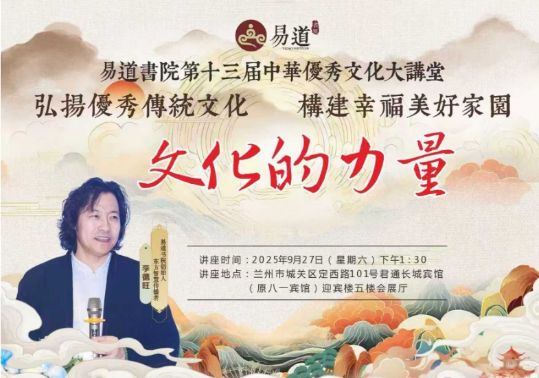 響應(yīng)時代號召,弘揚(yáng)傳統(tǒng)文化,旨在文化賦能行業(yè)發(fā)展,易道書院第十三屆中華優(yōu)秀文化大講堂將于9月27日在蘭州君通長城賓館(原八一賓館)迎賓樓五樓會展廳開講,誠邀有志之士共襄盛舉,學(xué)習(xí)傳統(tǒng)文化,賦能行業(yè)文明,構(gòu)建美好家園!