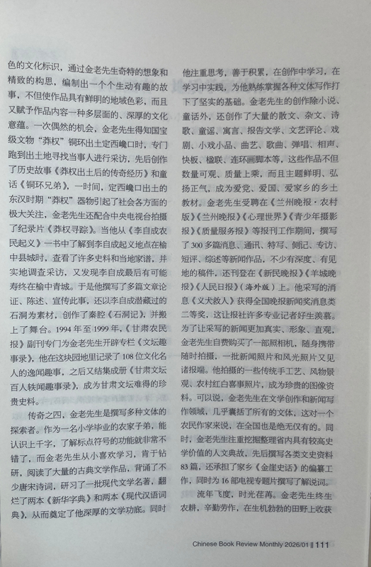 傳奇之四,金老先生是撰寫多種文體的探索者。作為一名小學(xué)畢業(yè)的農(nóng)家子弟,能認(rèn)識(shí)上千字,了解標(biāo)點(diǎn)符號(hào)的功能就非常不錯(cuò)了,而金老先生從小喜歡學(xué)習(xí),肯于鉆研,閱讀了大量的古典文學(xué)作品,背誦了不少唐宋詩(shī)詞,研習(xí)了一批現(xiàn)代文學(xué)名著,翻爛了兩本《新華字典》和兩本《現(xiàn)代漢語詞典》,從而奠定了他深厚的文學(xué)功底。同時(shí)他注重思考,善于積累,在創(chuàng)作中學(xué)習(xí),在學(xué)習(xí)中實(shí)踐,為他熟練掌握各種文體寫作打下了堅(jiān)實(shí)的基礎(chǔ)。金老先生的創(chuàng)作除小說、童話外,還創(chuàng)作了大量的散文、雜文、詩(shī)歌、童謠、寓言、報(bào)告文學(xué)、文藝評(píng)論、戲劇、小戲小品、曲藝、歌曲、彈唱、相聲、快板、楹聯(lián)、連環(huán)畫腳本等,這些作品不但數(shù)量可觀、質(zhì)量上乘,而且主題鮮明、弘揚(yáng)正氣,成為愛黨、愛國(guó)、愛家鄉(xiāng)的鄉(xiāng)土教材。金老先生受聘在《蘭州晚報(bào)·農(nóng)村版》《蘭州晚報(bào)》《心理世界》《青少年攝影報(bào)》《質(zhì)量服務(wù)報(bào)》等報(bào)刊工作期間,撰寫了300多篇消息、通訊、特寫、側(cè)記、專訪、短評(píng)、綜述等新聞作品,不少有深度、有見地的稿件,還刊登在《新民晚報(bào)》《羊城晚報(bào)》《人民日?qǐng)?bào)》(海外版)上。他采寫的消息《義犬救人》獲得全國(guó)晚報(bào)新聞獎(jiǎng)消息類二等獎(jiǎng),這讓報(bào)社許多專業(yè)記者好生羨慕。為了讓采寫的新聞更加真實(shí)、形象、直觀,金老先生自費(fèi)購(gòu)買了一部照相機(jī),隨身攜帶隨時(shí)拍攝,一批新聞?wù)掌惋L(fēng)光照片又見諸報(bào)端。他拍攝的一些傳統(tǒng)手工藝、風(fēng)物景觀、農(nóng)村紅白喜事照片,成為珍貴的圖像資料??梢哉f,金老先生在文學(xué)創(chuàng)作和新聞寫作領(lǐng)域,幾乎囊括了所有的文體,這對(duì)一個(gè)農(nóng)民作家來說,在全國(guó)也是絕無僅有的。同時(shí),金老先生注重挖掘整理省內(nèi)具有較高史學(xué)價(jià)值的人文典故,先后撰寫各類文史資料83篇,還承擔(dān)了家鄉(xiāng)《金崖史話》的編纂工作,同時(shí)為16部電視專題片撰寫了解說詞。