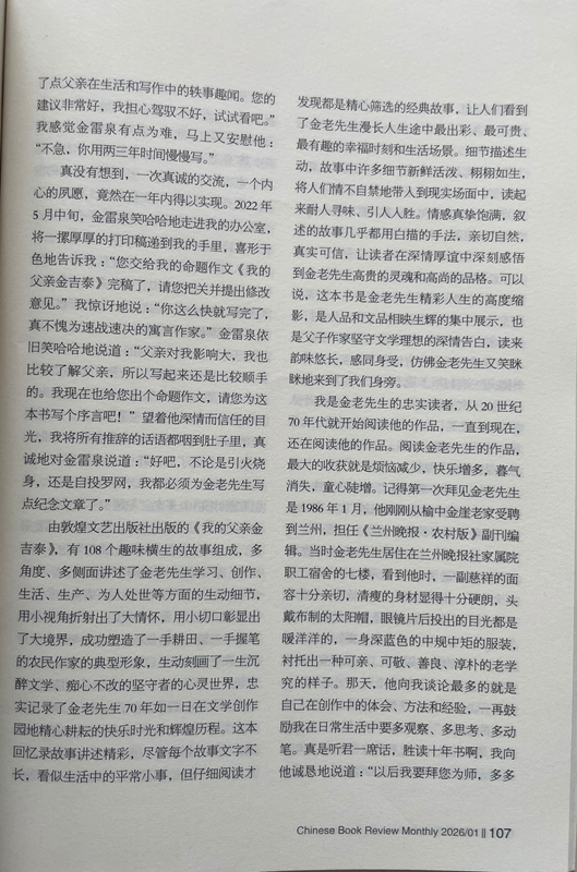 由敦煌文藝出版社出版的《我的父親金吉泰》,有108個(gè)趣味橫生的故事組成,多角度、多側(cè)面講述了金老先生學(xué)習(xí)、創(chuàng)作、生活、生產(chǎn)、為人處世等方面的生動(dòng)細(xì)節(jié),用小視角折射出了大情懷,用小切口彰顯出了大境界,成功塑造了一手耕田、一手握筆的農(nóng)民作家的典型形象,生動(dòng)刻畫了一生沉醉文學(xué)、癡心不改的堅(jiān)守者的心靈世界,忠實(shí)記錄了金老先生70年如一日在文學(xué)創(chuàng)作園地精心耕耘的快樂時(shí)光和輝煌歷程。這本回憶錄故事講述精彩,盡管每個(gè)故事文字不長(zhǎng),看似生活中的平常小事,但仔細(xì)閱讀才發(fā)現(xiàn)都是精心篩選的經(jīng)典故事,讓人們看到了金老先生漫長(zhǎng)人生途中最出彩、最可貴、最有趣的幸福時(shí)刻和生活場(chǎng)景。細(xì)節(jié)描述生動(dòng),故事中許多細(xì)節(jié)新鮮活潑、栩栩如生,將人們情不自禁地帶入到現(xiàn)實(shí)場(chǎng)面中,讀起來耐人尋味、引人入勝。情感真摯飽滿,敘述的故事幾乎都用白描的手法,親切自然,真實(shí)可信,讓讀者在深情厚誼中深刻感悟到金老先生高貴的靈魂和高尚的品格。可以說,這本書是金老先生精彩人生的高度縮影,是人品和文品相映生輝的集中展示,也是父子作家堅(jiān)守文學(xué)理想的深情告白,讀來韻味悠長(zhǎng),感同身受,仿佛金老先生又笑瞇瞇地來到了我們身旁。