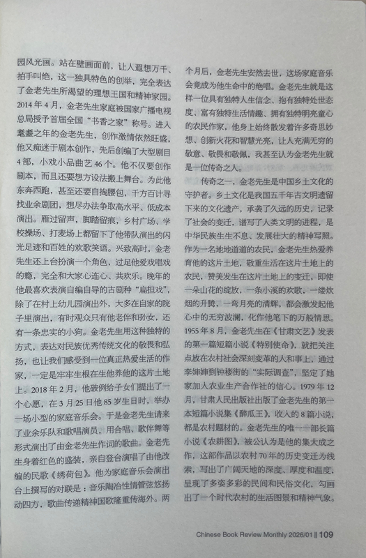從此之后,我與金老先生的交往越來越密切,交流的話題也越來越廣泛,每次見面,他給我最多的就是鼓勵(lì):“小楊啊,你在《人民日?qǐng)?bào)》上發(fā)表的寫奧運(yùn)會(huì)的散文,看得我都激動(dòng)了。”“小楊啊,《詩(shī)刊》上發(fā)表大作了,值得祝賀!”“小楊啊,你的創(chuàng)作達(dá)到了新的水準(zhǔn),都登上國(guó)刊《人民文學(xué)》了。”有一次,金老先生得知我在《星星》詩(shī)刊舉辦的首屆農(nóng)民工詩(shī)歌大獎(jiǎng)賽中獲獎(jiǎng)的消息后,專門打來電話:“小楊啊,向你表示祝賀,你的獲獎(jiǎng)作品表達(dá)了我們農(nóng)民工的心聲!”金老先生與人相處,傳遞的絕對(duì)是正能量,從我與他交往的30多年時(shí)光里,從來沒有聽到過他非議別人。后來才慢慢發(fā)現(xiàn),他有與眾不同的精神境界、質(zhì)樸品格、為人方式和處事態(tài)度,他靈魂深處永遠(yuǎn)流淌著向善、向上、向真、向美的價(jià)值取向,渾身上下始終洋溢著執(zhí)著、豁達(dá)、樂觀、寬容的人格魅力。一個(gè)地地道道的農(nóng)民,從當(dāng)年只有小學(xué)文化程度,靠勤奮自學(xué)70年堅(jiān)持筆耕不輟,出版各種作品集25部,共計(jì)400多萬字,被中共甘肅省委、甘肅省人民政府授予“甘肅省文藝終身成就獎(jiǎng)”。對(duì)一個(gè)農(nóng)民來說,這在全國(guó)也是屈指可數(shù)的。年近80歲的時(shí)候,在患嚴(yán)重眼疾幾乎導(dǎo)致雙目失明的情況下,每天堅(jiān)持寫作兩三千字,用10個(gè)月時(shí)間,完成了45萬字的長(zhǎng)篇小說《農(nóng)耕圖》,榮獲甘肅省文學(xué)藝術(shù)類政府最高獎(jiǎng)——敦煌文藝獎(jiǎng),金老先生的頑強(qiáng)毅力和拼命勁頭也是罕見的。20世紀(jì)80年代初,他以家鄉(xiāng)榆中縣金崖鄉(xiāng)文化站為依托,創(chuàng)辦了全省第一個(gè)農(nóng)民文學(xué)社——苑川文學(xué)社,舉辦“文學(xué)創(chuàng)作講習(xí)班”,吸引方圓村鎮(zhèn)100多名“泥腿子”文學(xué)愛好者參與其中,每當(dāng)經(jīng)他修改、推薦的作品發(fā)表后,年過半百的他總是騎上自行車跑幾十公里路,喜滋滋地將樣報(bào)樣刊送到作者手里,金老先生樂此不疲為文學(xué)愛好者全方位服務(wù)的情懷,在當(dāng)下是不多見的,更加顯得彌足珍貴。興趣廣泛的金老先生在晚年時(shí)突發(fā)奇想,在老宅院子里啟動(dòng)了家庭美化工程,自己設(shè)計(jì)、自己施工,在自家院子西墻上,用五顏六色的小石子創(chuàng)作了一幅長(zhǎng)八米、寬二米的巨型壁畫,畫面上有紅日、山水、碌碡、西瓜、樹木、小鹿、大雁、人物,還有太陽(yáng)灶、飛機(jī)、衛(wèi)星,好一幅天人合一的田園風(fēng)光畫。站在壁畫面前,讓人遐想萬千、拍手叫絕,這一獨(dú)具特色的創(chuàng)舉,完全表達(dá)了金老先生所渴望的理想王國(guó)和精神家園。2014年4月,金老先生家庭被國(guó)家廣播電視總局授予首屆全國(guó)“書香之家”稱號(hào)。進(jìn)入耄耋之年的金老先生,創(chuàng)作激情依然旺盛,他又癡迷于劇本創(chuàng)作,先后創(chuàng)編了大型劇目4部,小戲小品曲藝46個(gè)。他不僅要?jiǎng)?chuàng)作劇本,而且還要想方設(shè)法搬上舞臺(tái)。為此他東奔西跑,甚至還要自掏腰包,千方百計(jì)尋找業(yè)余劇團(tuán),想盡辦法爭(zhēng)取高水平、低成本演出。雁過留聲,腳踏留痕,鄉(xiāng)村廣場(chǎng)、學(xué)校操場(chǎng)、打麥場(chǎng)上都留下了他帶隊(duì)演出的閃光足跡和百姓的歡歌笑語。興致高時(shí),金老先生還上臺(tái)扮演一個(gè)角色,過足他愛戲唱戲的癮,完全和大家心連心、共歡樂。晚年的他最喜歡表演自編自導(dǎo)的古劇種“扁擔(dān)戲”,除了在村上幼兒園演出外,大多在自家的院子里演出,有時(shí)觀眾只有他老伴和孫女,還有一條忠實(shí)的小狗。金老先生用這種獨(dú)特的方式,表達(dá)對(duì)民族優(yōu)秀傳統(tǒng)文化的敬畏和弘揚(yáng),也讓我們感受到一位真正熱愛生活的作家,一定是牢牢生根在生他養(yǎng)他的這片土地上。2018年2月,他破例給子女們提出了一個(gè)心愿,在3月25日他85歲生日時(shí),舉辦一場(chǎng)小型的家庭音樂會(huì)。于是金老先生請(qǐng)來了業(yè)余樂隊(duì)和歌唱演員,用合唱、歌伴舞等形式演出了由金老先生作詞的歌曲。金老先生身著紅色的盛裝,親自登臺(tái)演唱了由他改編的民歌《繡荷包》。他為家庭音樂會(huì)演出臺(tái)上撰寫的對(duì)聯(lián)是:音樂陶冶性情管弦悠揚(yáng)動(dòng)四方,歌曲傳遞精神國(guó)歌隆重傳海外。兩個(gè)月后,金老先生安然去世,這場(chǎng)家庭音樂會(huì)竟成為他生命中的絕唱。金老先生就是這樣一位具有獨(dú)特人生信念、抱有獨(dú)特處世態(tài)度、富有獨(dú)特生活情趣、擁有獨(dú)特明亮童心的農(nóng)民作家,他身上始終散發(fā)著許多奇思妙想、創(chuàng)新火花和智慧光亮,讓人充滿無窮的敬意、敬畏和敬佩,我甚至認(rèn)為金老先生就是一位傳奇之人。
