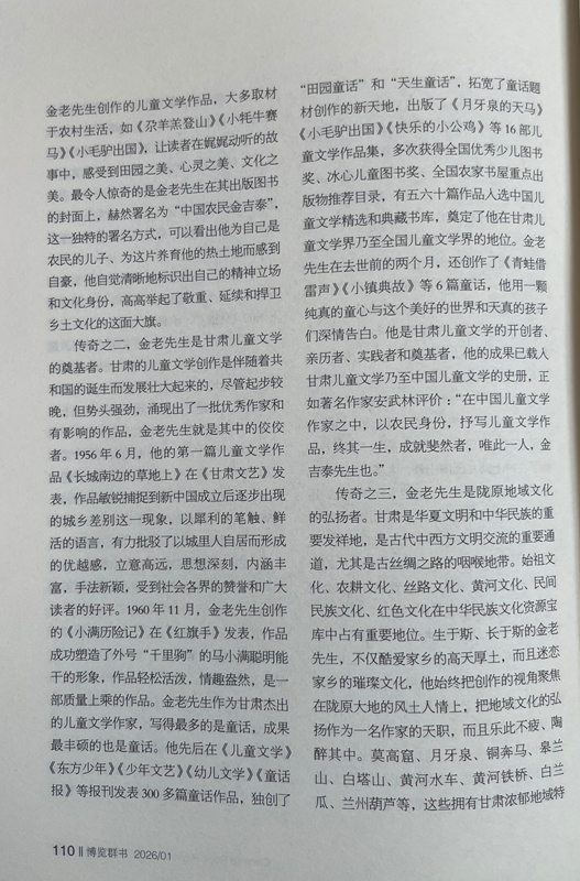 傳奇之二,金老先生是甘肅兒童文學(xué)的奠基者。甘肅的兒童文學(xué)創(chuàng)作是伴隨著共和國(guó)的誕生而發(fā)展壯大起來的,盡管起步較晚,但勢(shì)頭強(qiáng)勁,涌現(xiàn)出了一批優(yōu)秀作家和有影響的作品,金老先生就是其中的佼佼者。1956年6月,他的第一篇兒童文學(xué)作品《長(zhǎng)城南邊的草地上》在《甘肅文藝》發(fā)表,作品敏銳捕捉到新中國(guó)成立后逐步出現(xiàn)的城鄉(xiāng)差別這一現(xiàn)象,以犀利的筆觸、鮮活的語言,有力批駁了以城里人自居而形成的優(yōu)越感,立意高遠(yuǎn),思想深刻,內(nèi)涵豐富,手法新穎,受到社會(huì)各界的贊譽(yù)和廣大讀者的好評(píng)。1960年11月,金老先生創(chuàng)作的《小滿歷險(xiǎn)記》在《紅旗手》發(fā)表,作品成功塑造了外號(hào)“千里駒”的馬小滿聰明能干的形象,作品輕松活潑,情趣盎然,是一部質(zhì)量上乘的作品。金老先生作為甘肅杰出的兒童文學(xué)作家,寫得最多的是童話,成果最豐碩的也是童話。他先后在《兒童文學(xué)》《東方少年》《少年文藝》《幼兒文學(xué)》《童話報(bào)》等報(bào)刊發(fā)表300多篇童話作品,獨(dú)創(chuàng)了“田園童話”和“天生童話”,拓寬了童話題材創(chuàng)作的新天地,出版了《月牙泉的天馬》《小毛驢出國(guó)》《快樂的小公雞》等16部?jī)和膶W(xué)作品集,多次獲得全國(guó)優(yōu)秀少兒圖書獎(jiǎng)、冰心兒童圖書獎(jiǎng)、全國(guó)農(nóng)家書屋重點(diǎn)出版物推薦目錄,有五六十篇作品入選中國(guó)兒童文學(xué)精選和典藏書庫(kù),奠定了他在甘肅兒童文學(xué)界乃至全國(guó)兒童文學(xué)界的地位。金老先生在去世前的兩個(gè)月,還創(chuàng)作了《青蛙借雷聲》《小鎮(zhèn)典故》等6篇童話,他用一顆純真的童心與這個(gè)美好的世界和天真的孩子們深情告白。他是甘肅兒童文學(xué)的開創(chuàng)者、親歷者、實(shí)踐者和奠基者,他的成果已載入甘肅兒童文學(xué)乃至中國(guó)兒童文學(xué)的史冊(cè),正如著名作家安武林評(píng)價(jià):“在中國(guó)兒童文學(xué)作家之中,以農(nóng)民身份,抒寫兒童文學(xué)作品,終其一生,成就斐然者,唯此一人,金吉泰先生也。”
