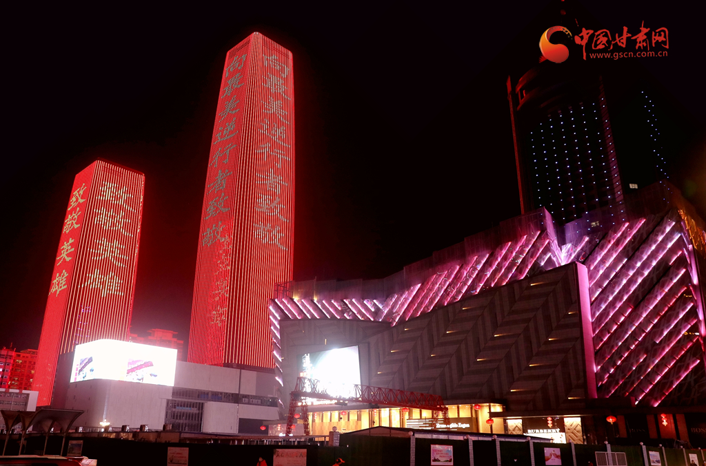 2月21日至23日,蘭州為抗疫一線英雄舉行亮燈活動。這是2月21日鴻運(yùn)金茂樓體用燈光顯示出“向最美逆行者致敬”“致敬英雄”的文字向英雄致敬。