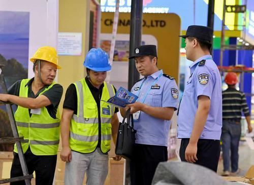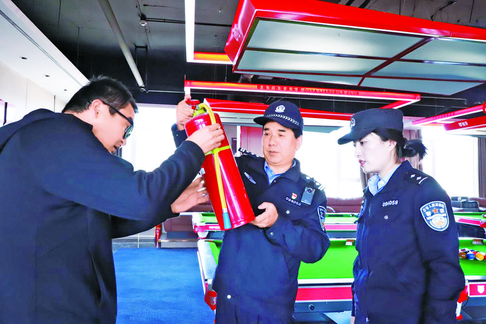 王進保(右)在經(jīng)營場所檢查消防安全。