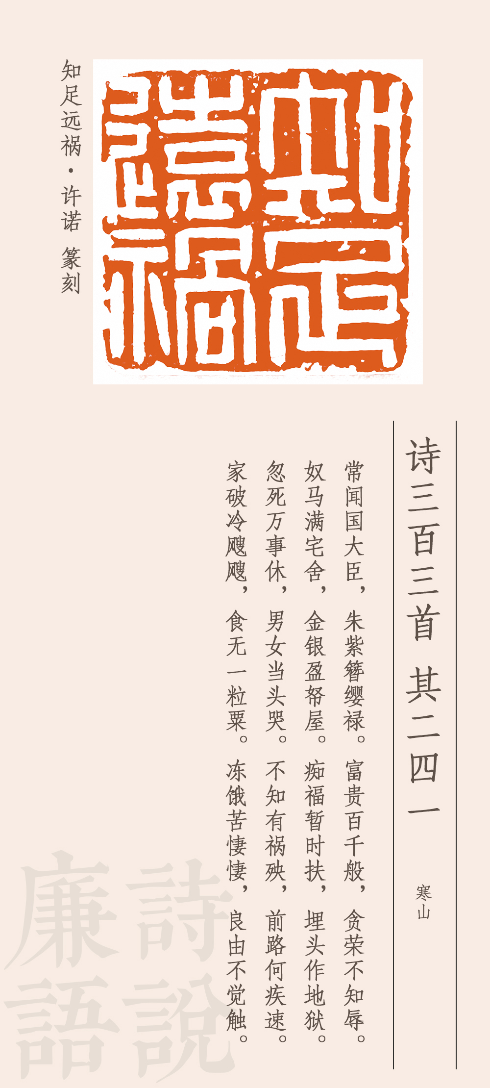 這首詩(shī)是諷刺高官貪圖富貴、聚斂財(cái)物的。他說,有些國(guó)之大臣,穿戴尊榮,好不威風(fēng),享受千般榮華富貴,卻一點(diǎn)兒都不顧及廉恥榮辱,家中擁有大量駿馬奴仆,屋子里堆滿金銀財(cái)寶,自以為這是在享福,其實(shí)是在給自己挖墳?zāi)沟鬲z。一旦死去,萬事皆休,富貴是無法永久保留的。如果因貪腐而遭受禍殃,那下場(chǎng)就會(huì)很慘。家破人亡,挨凍受餓,凄風(fēng)苦雨,苦不堪言。最后一句卒章顯志:之所以會(huì)有這樣的遭遇和結(jié)局,是因?yàn)闆]有悟透取禍的原因。這個(gè)原因從前面所述來看,就是太貪婪、不知足。