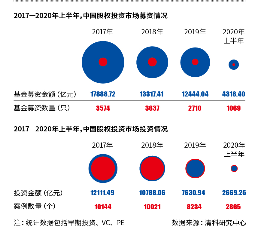 從清科研究中心公布的數(shù)據(jù),亦可窺見(jiàn)2020年上半年募資難與投資緊的全貌。該研究中心數(shù)據(jù)顯示,2020年上半年市場(chǎng)共有1069只基金完成新一輪募集,金額總計(jì)4318.40億元人民幣,同比下降29.5%;市場(chǎng)共發(fā)生2865起投資事件,涉及金額2669.25億元,同比分別下滑32.7%、21.5%。