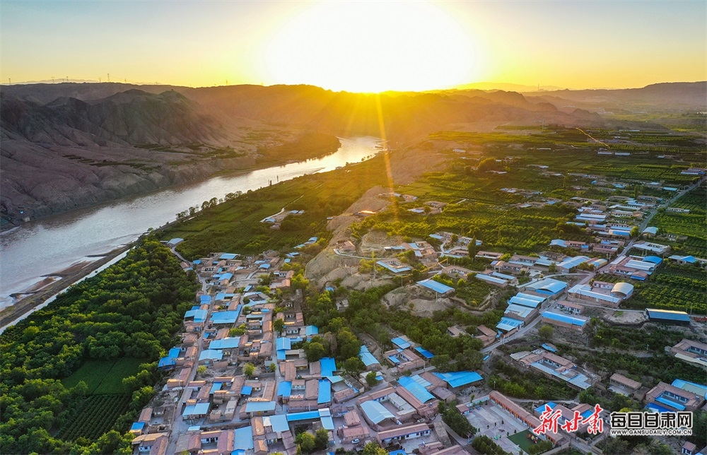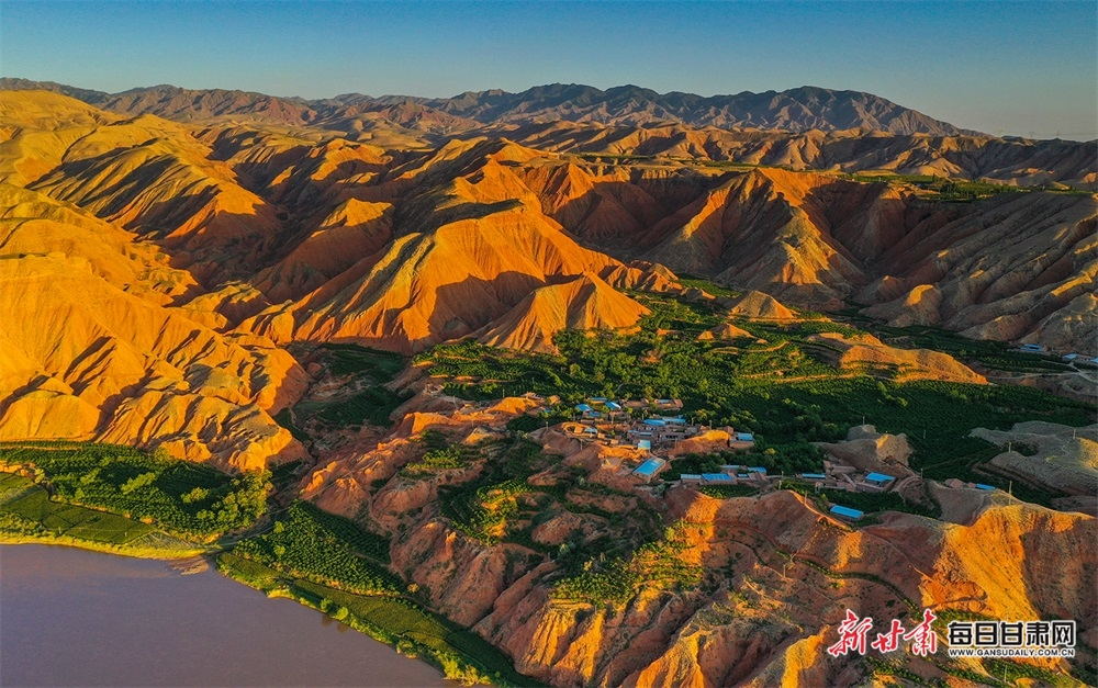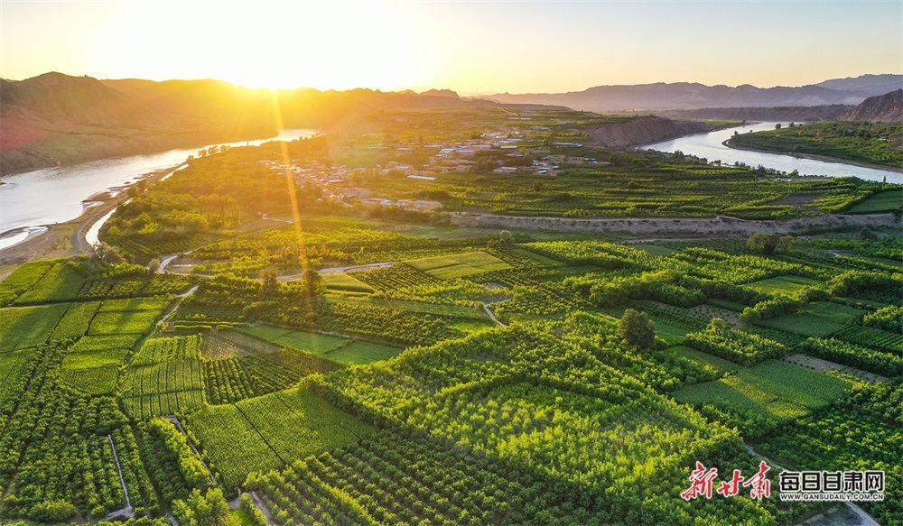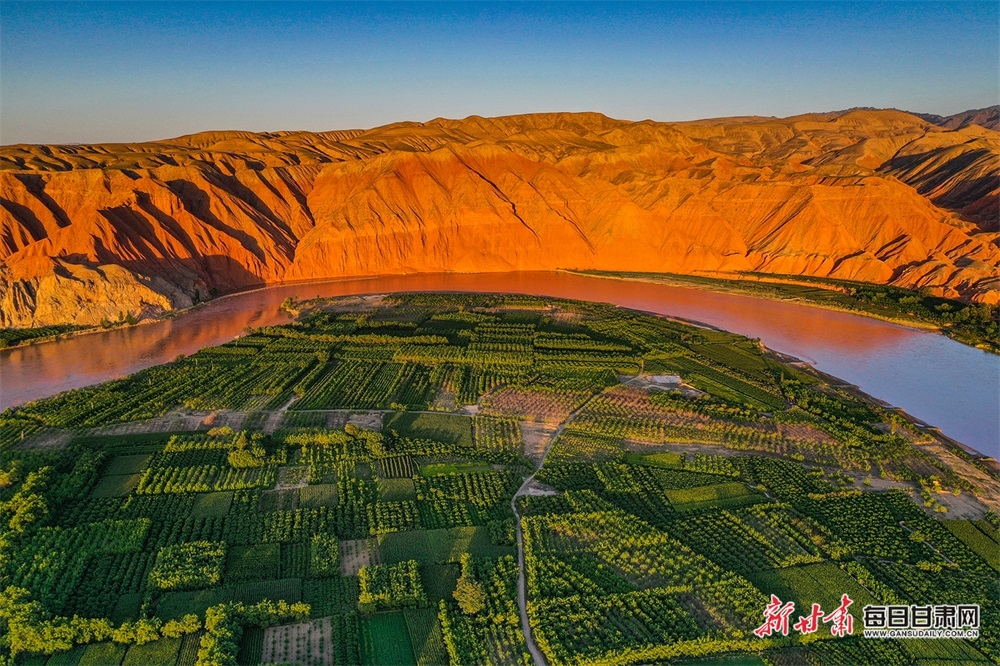 夏日,夕陽(yáng)西下,黃河在景泰五佛鄉(xiāng)境內(nèi)的車(chē)木峽繞了個(gè)大大的彎,位于黃河峽谷中的 車(chē)木峽山村高山環(huán)繞,周?chē)浅善臉?shù)林,廣袤的田野閃耀著瑰麗的色彩,靜靜地躺在綠色的懷抱之中。