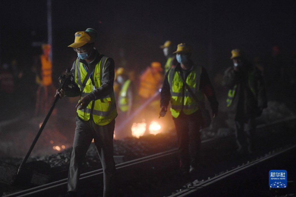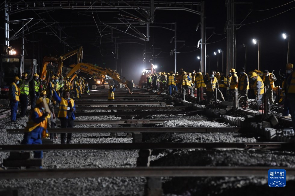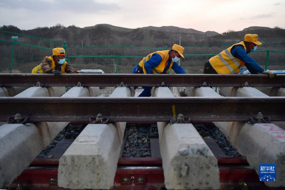 中鐵十一局建設(shè)者在中蘭客專(甘肅段)接入中川城際鐵路道岔插鋪施工現(xiàn)場作業(yè)(4月26日攝)。新華社記者 陳斌 攝