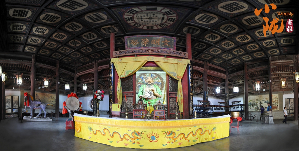 先天殿莊嚴(yán)肅穆,殿內(nèi)正中便是高達3米的人文始祖伏羲坐身塑像,樹葉披身,手持八卦盤,氣宇軒昂,雙目炯炯凝視前方,神龕上方懸掛著清嘉慶時州牧王賜均書“文明肇啟”巨匾,仰頭上望,頂上繪有河圖洛書、六十四卦,令人肅然起敬。