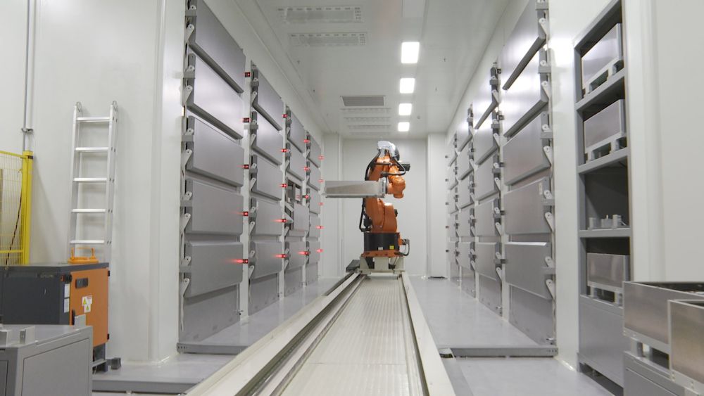 在一家企業(yè)的干燥車間內(nèi),六軸機(jī)器人正在搬運(yùn)成品電池。(受訪單位供圖)