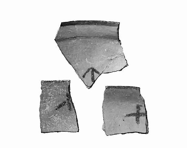 遺址中出土的帶有彩繪符號(hào)的陶片。
