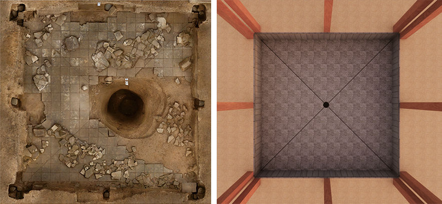 這是四角坪遺址中央夯土臺基中心的半地穴空間及甘肅考古工作者繪制的復(fù)原圖。
