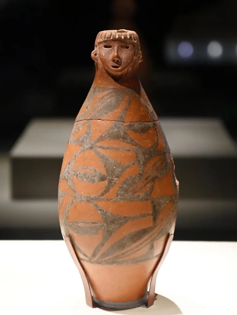 大地灣出土的人頭形器口彩陶瓶。新華社記者范培珅攝