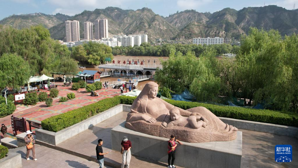 游客在位于黃河蘭州段南岸的黃河母親雕像參觀游覽(9月25日攝,無人機(jī)照片)。新華社記者陳斌攝