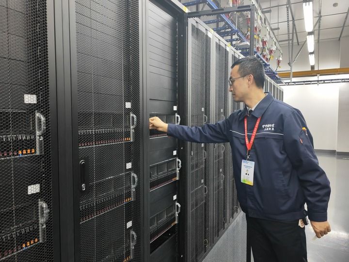 國家數(shù)據(jù)中心集群(甘肅·慶陽)“東數(shù)西算”產業(yè)園區(qū),工作人員在機柜旁作業(yè)(2024年10月28日攝)。新華社記者 梁軍 攝