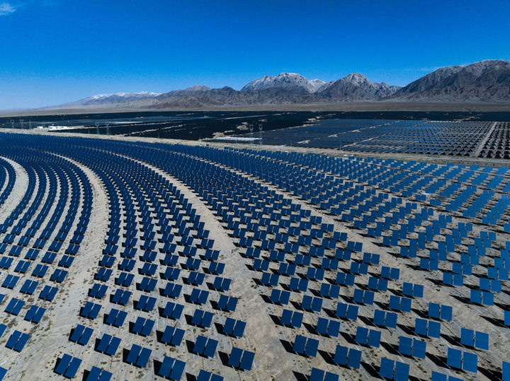 青海省海西蒙古族藏族自治州德令哈市光伏(光熱)產業(yè)園的光熱電站(2024年4月23日攝,無人機照片)。新華社記者 張龍 攝