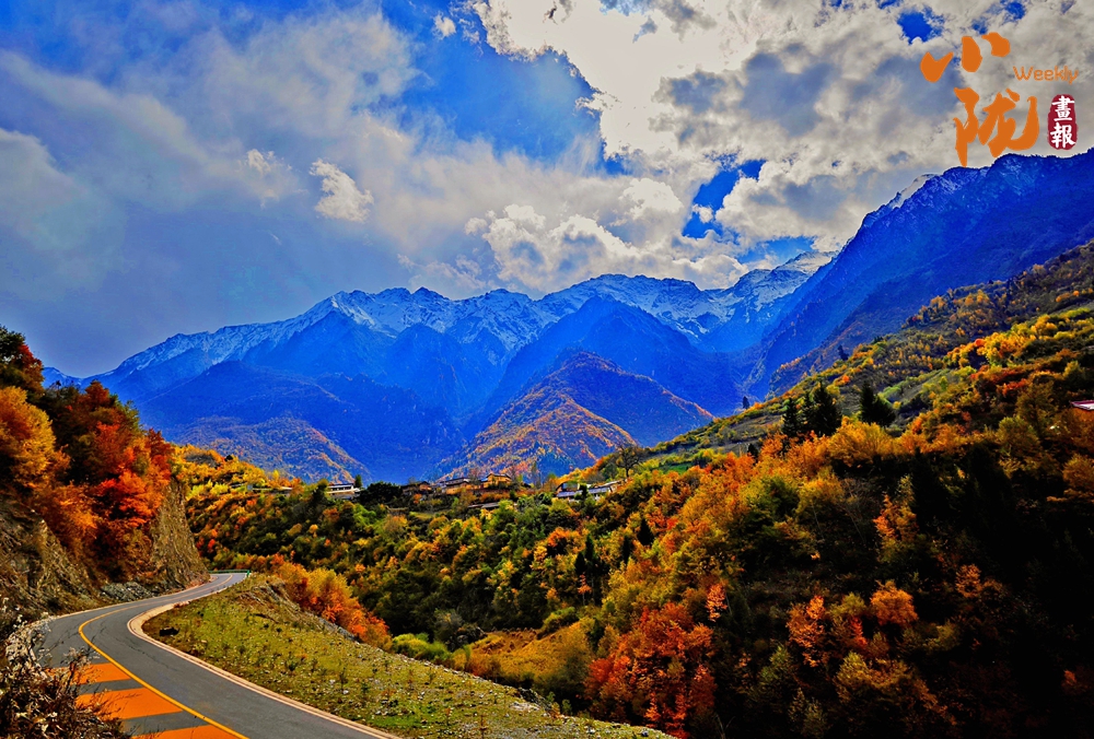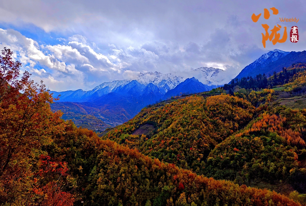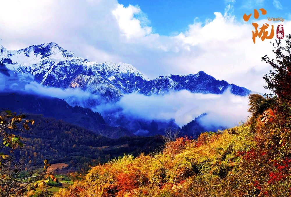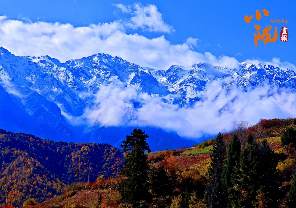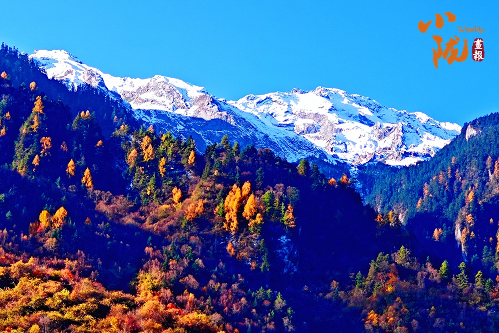 山巔的白雪與彩林形成鮮明對(duì)比,紅與黃,白與藍(lán),在陽(yáng)光的映照下,共同編織出一幅溫柔而夢(mèng)幻的畫卷。