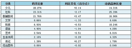 從細分市場情況來看,中小學幼兒園教材、法律、傳記、學術(shù)文化、教輔和少兒類呈現(xiàn)正向增長,其余類別均表現(xiàn)為同比負增長。