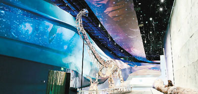 進(jìn)入展廳,人們首先會被來自侏羅紀(jì)時代的龐然大物——中加馬門溪龍化石所震撼。馬門溪龍是中國發(fā)現(xiàn)的體型最大的蜥腳類恐龍之一,頸部特別長。這具化石出土于新疆奇臺縣,2016年修復(fù)裝架完成,高7.5米,長24米,脖子就有12米長。