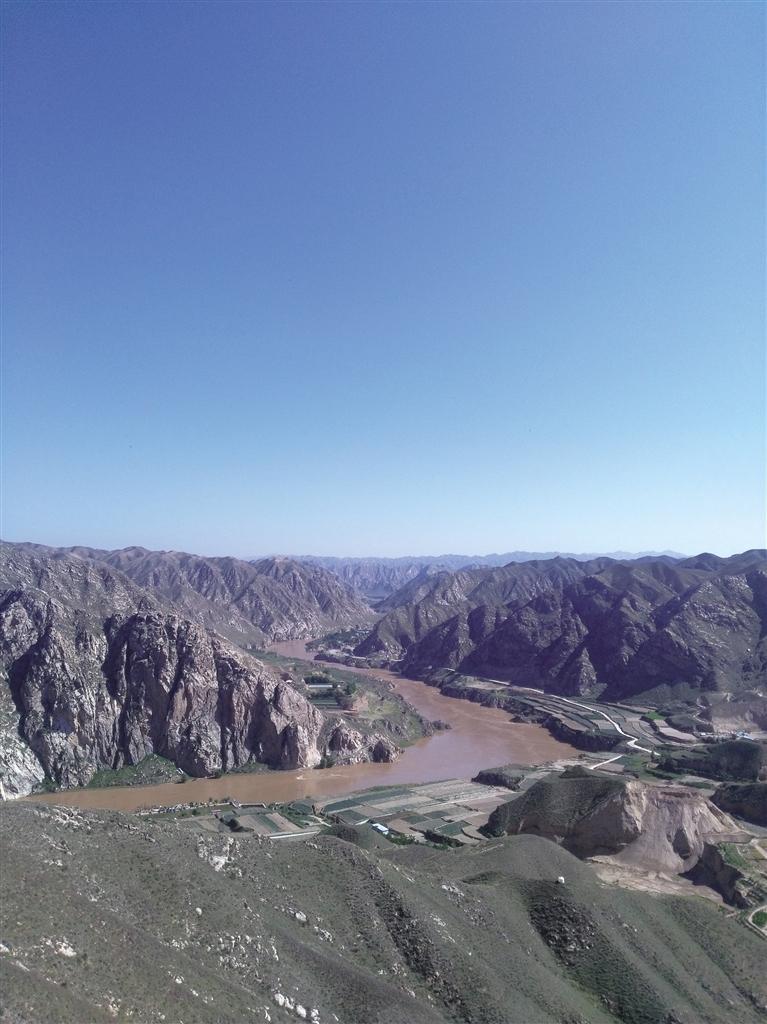向西鳥瞰黃河,黃河幾乎直線撲面而來,河水發(fā)黃,流淌緩慢。過去這里,河水湍急,老遠(yuǎn)就能聽到咆哮之聲。由于20世紀(jì)末,在下游20公里處建了小峽水庫,河水被抬升,河水流緩。黃河北面,依然是光禿禿的山巒。低頭看腳下的黃河,南岸的漢長城遺址清晰可見,旁邊有二三個(gè)人在農(nóng)田勞作。黃河流到此處,被腳下的九圪垯山迎面阻擋,折而向北,切開重重山巒,帶著野性,蜿蜒而去,一點(diǎn)兒也不留戀桑園子峽,不留戀九圪垯山,不留戀滄桑的大地和歲月。