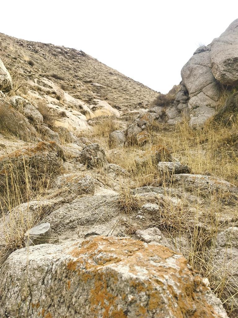 東坪向東300米,就是榆中境內(nèi)唯一遺留的一處漢長城遺址,該遺址現(xiàn)只有一處墻墩,緊鄰黃河,圍長40 余米,高約5米,無任何防護(hù)措施,墻壁上,有磚、石混雜其中,人工夯筑之痕清晰可辨。西側(cè)墻面上,還有人掏挖的小窯洞。高1.3米,深達(dá)50厘米。破壞嚴(yán)重。漢長城遺址再向東200米,東金公路向右拐入七峴溝,向來紫堡川而去,而黃河則被東面的大山阻擋,無路可去,左拐北折而流向什川。此處就是著名的黃河大“幾”字灣的第一灣。第一灣的南岸,有十來戶人家,地名叫駱圈灣。由于地處古絲綢之路,曾建有駱駝圈和小型客棧供駱駝客隊(duì)歇腳而又在黃河拐彎處而得名,后來,因諧音,叫羅泉灣。山腳下,有七八棵楊柳已吐綠。沿黃河,已無路可尋,就沿洪水沖的山溝上東山,還是無路,甚至沒有羊腸小道,巖石裸露,怪石嶙峋,坡陡難行。巖石層只有七八十米厚。此山的石頭,含有石英成分,石質(zhì)軟,無開采利用價(jià)值。再往上,就是黃土層,直到山頂。由于干旱,整個(gè)山上,無一棵樹木,甚至連灌木都沒有。耐堿耐旱的駱駝蓬只發(fā)出二厘米的枝蔓,一些蒿草和矮草,也剛發(fā)芽,還有一些匍匐在地面的無名小草,卻已開出了扁豆大小的艷麗的小花,有白色的和淡藍(lán)色的蝴蝶飛起飛落。爬到半山腰,太陽已全面照曬,山坡雖陡峭,卻無陰涼可乘。渾身發(fā)熱,不得不解開衣扣,緩慢前行。