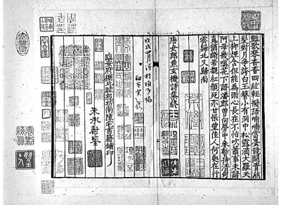范景中先生曾見(jiàn)過(guò)謝蘭墀擺印本《唐宋文醇》,是書(shū)“正文用墨印,墨點(diǎn)用朱印,御評(píng)用黃印,朱子評(píng)用朱印,各家評(píng)用藍(lán)印,實(shí)為四色套印”。至于《唐宋詩(shī)醇》,范先生認(rèn)為是木活字五色套印。其主要依據(jù)是《詩(shī)醇》凡例云:“評(píng)語(yǔ)悉準(zhǔn)《唐宋文醇》之例,色別書(shū)之,但其中有援據(jù)正史雜說(shuō)用資考訂疏解者,與古今人評(píng)詩(shī)之語(yǔ)義各有在,《文醇》未經(jīng)區(qū)別,今于藍(lán)筆之外,另作綠筆書(shū),以便閱者,燦若列眉。”按照凡例的說(shuō)法,《詩(shī)醇》在《文醇》朱、墨、黃、藍(lán)的基礎(chǔ)上又加了綠色,由此可知是五色套印本。實(shí)際上《唐宋詩(shī)醇》中并無(wú)康熙御評(píng),因此未用黃色。湖南省圖書(shū)館藏有一部謝蘭墀擺印本《唐宋詩(shī)醇》,八冊(cè),四十七卷全。我們委托張諾丕同學(xué)代檢全書(shū),亦僅朱、墨、藍(lán)、綠四色而已,由此可知楊成凱先生所說(shuō)四色套印本是正確的,而《增訂四庫(kù)簡(jiǎn)明目錄標(biāo)注》著錄的五色套印本恐不可信。