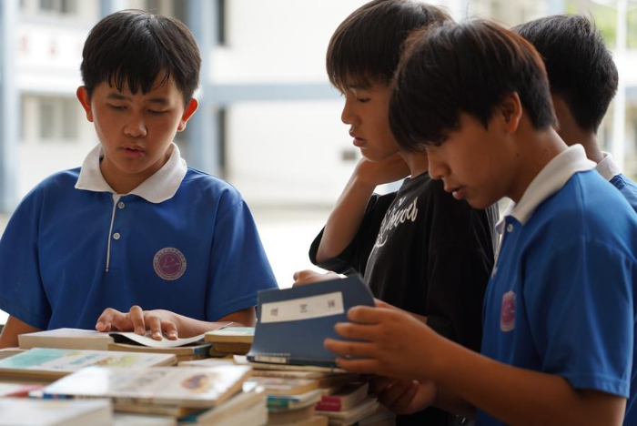 保山市隆陽區(qū)潞江鎮(zhèn)民族中學(xué)的學(xué)生們?cè)谛侣涑傻膱D書館看書(6月21日攝)。新華社發(fā)