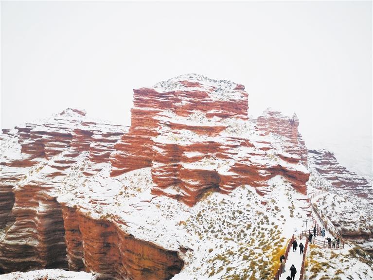 游客在景區(qū)觀景臺上伸手可觸摸到被白雪覆蓋的火紅色彩,峽谷內(nèi),山倚壁蜿蜒,峰隨地勢崢嶸,石林犬牙交錯,游客不時發(fā)出由衷的贊嘆,眼前的風(fēng)光如仙境一般。