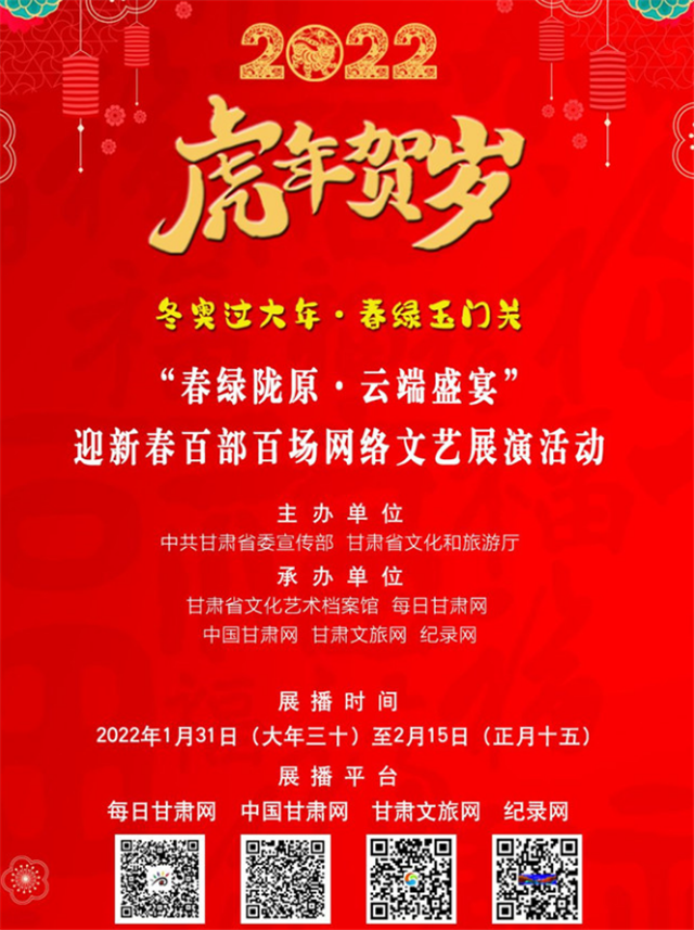 甘肅省博物館在春節(jié)期間舉辦了“虎虎生福——壬寅(虎年)新春生肖文物聯(lián)展”,甘肅省圖書館舉辦7大專題30余項(xiàng)文化體驗(yàn)活動(dòng)。在“春之華章”2022年甘肅省電視春節(jié)聯(lián)歡晚會(huì)上,原創(chuàng)話劇《八步沙》、隴劇《大禹治水》等精彩上演;甘肅省非遺保護(hù)中心開展了“虎虎有神過大年——如意甘肅·多彩非遺”宣傳推廣活動(dòng);甘肅演藝集團(tuán)通過線上線下結(jié)合方式,開展2022“我們的中國夢(mèng)”——文化進(jìn)萬家迎新春文藝演出活動(dòng);張掖市舉辦春節(jié)“九曲黃河燈陣啟燈納福非遺文化展演”活動(dòng)。