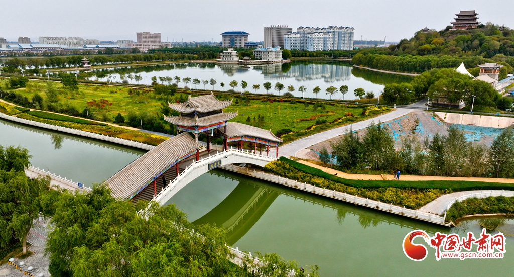 10月5日,鳥(niǎo)瞰甘肅省張掖市臨澤縣,人行步道沿湖蜿蜒,湖水清澈潔凈,岸邊美景倒映湖中,一幅繪著水鄉(xiāng)之美的畫(huà)卷躍然眼前。