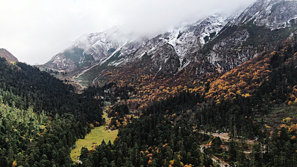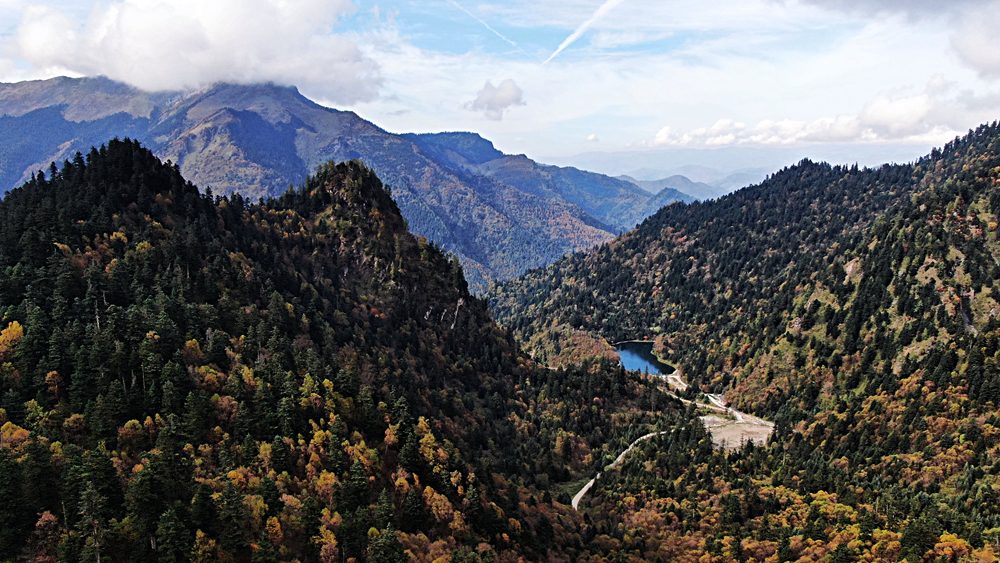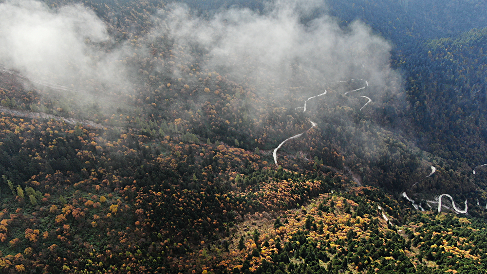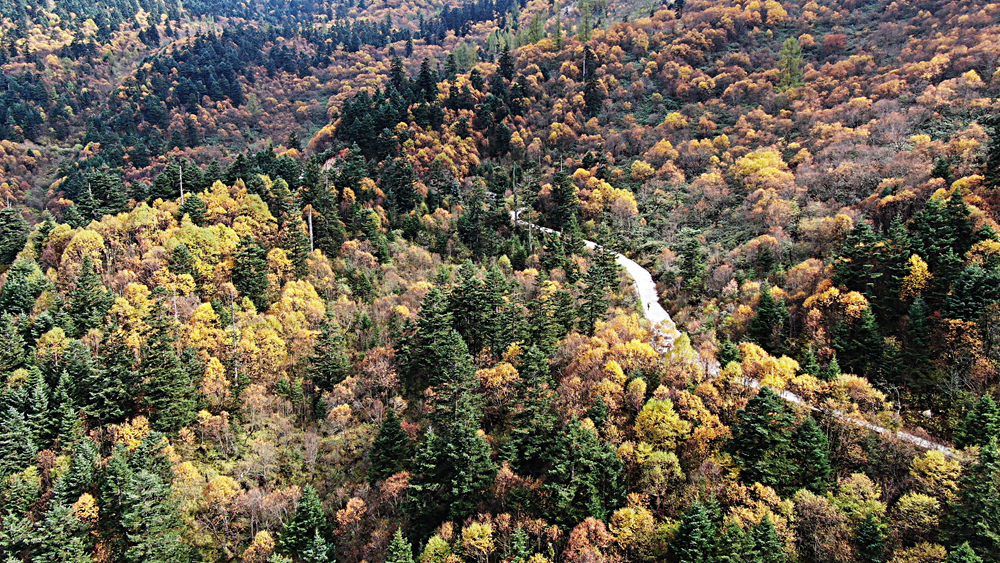 金秋時(shí)節(jié),甘肅省隴南市宕昌縣官鵝溝森林公園層林盡染,斑斕如畫,吸引了不少游客前來游玩。新華網(wǎng)發(fā)(劉輝 攝)