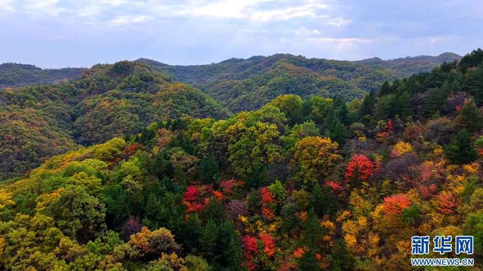 深秋時(shí)節(jié),甘肅省平?jīng)鍪谐缧趴h的唐帽山層林盡染,群山疊彩,勾勒出一幅絢麗多姿的美景圖。(圖片:高亮 文字:關(guān)改琴)